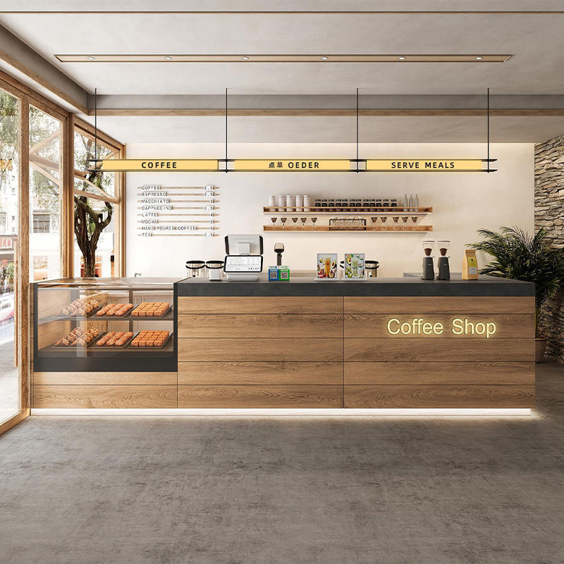 Banco Reception di Design da Bar in Legno Personalizzato in Stile Moderno con Espositore e Bancone Cassa per Panetteria e Caffetteria