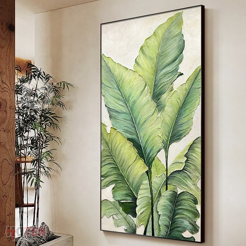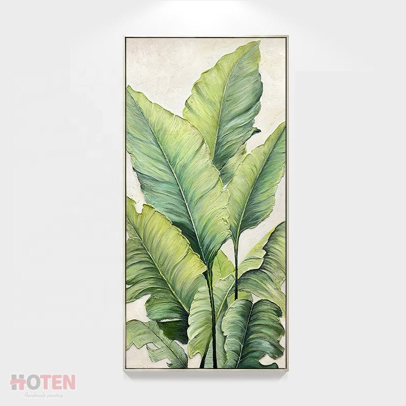 Modern Style Handpainted Canvas Oil Wall Art Abstract Green Leaves Big Leaf Oil Painting for Living Room Decorative Artwork