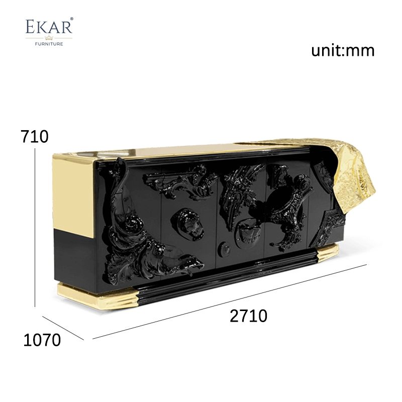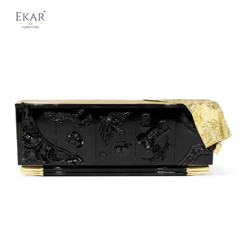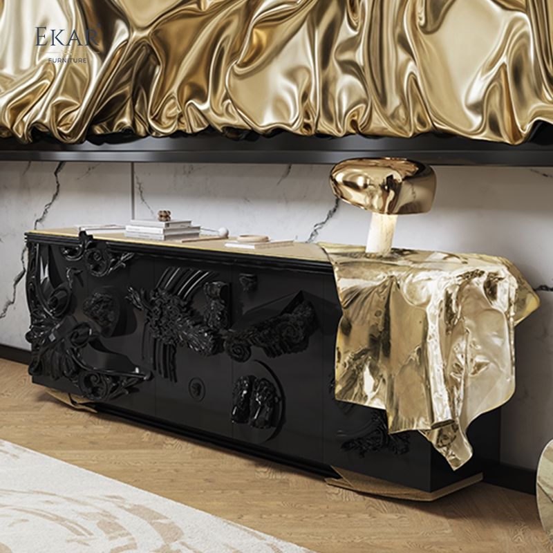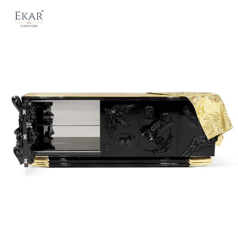 Mobile da soggiorno in stile moderno con elementi in rame: finitura nera lucida, intagli squisiti