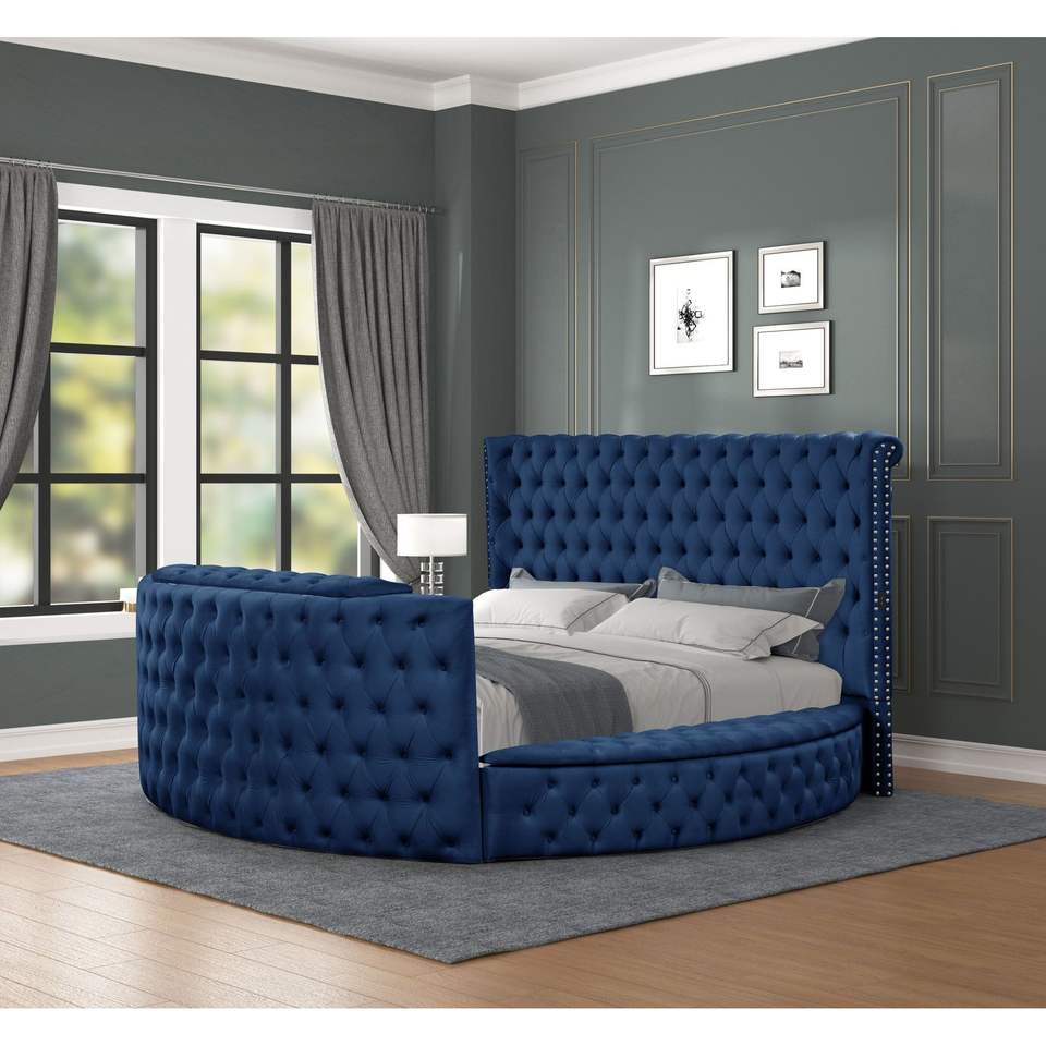 Letto matrimoniale in stile moderno con design trapuntato in cristallo, struttura in legno e rivestimento blu.