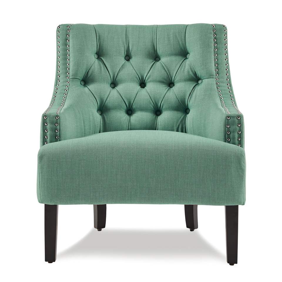Poltrona Moderna Tradizionale in Legno Massello con Rivestimento in Tessuto Testurizzato Verde Acqua e Bottoni Trapuntati per Soggiorno