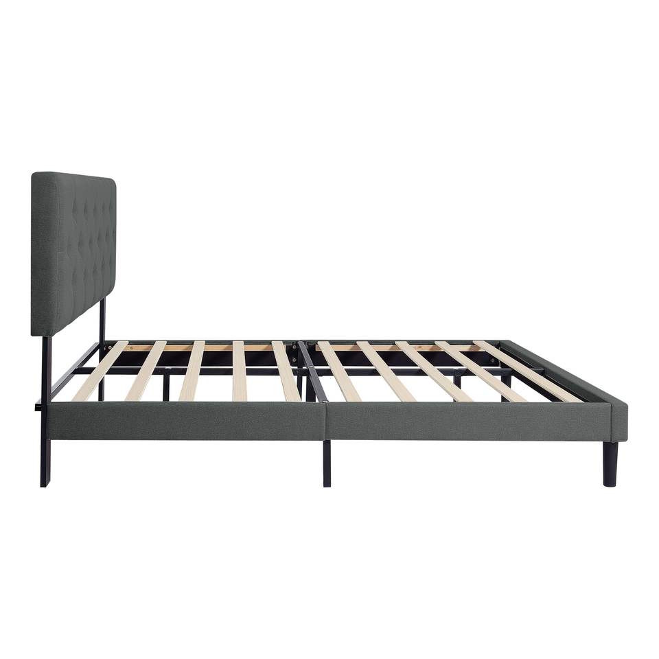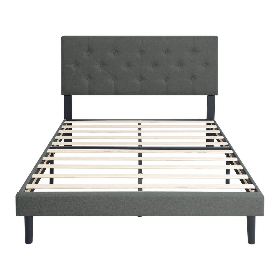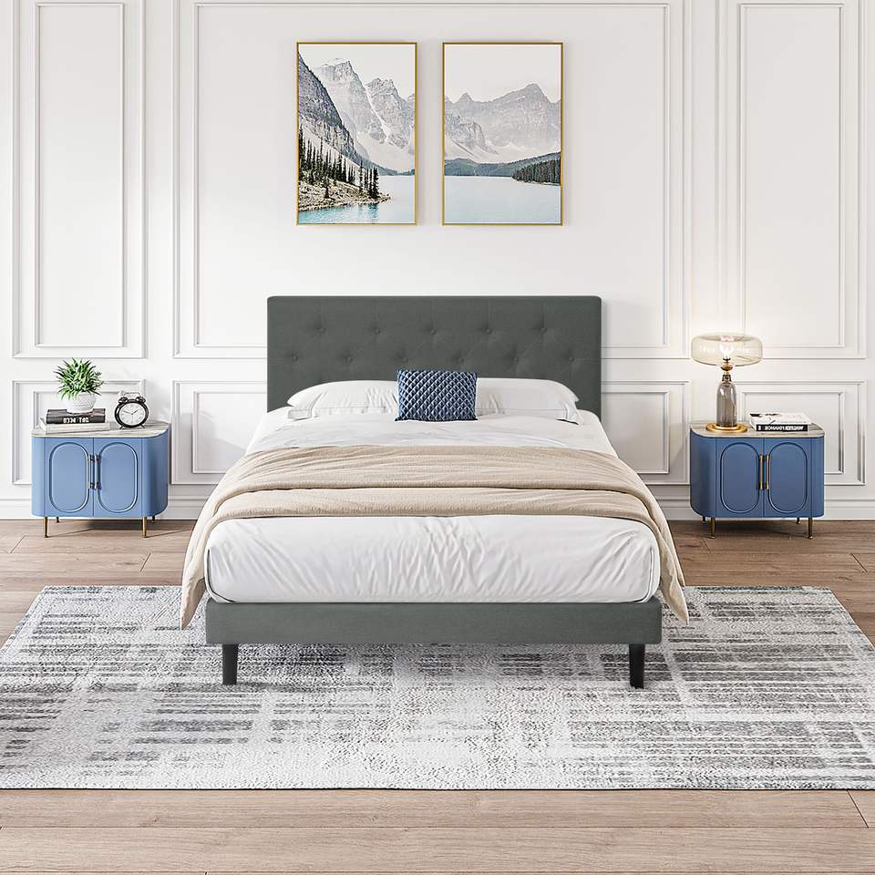 Letto Moderno Matrimoniale con Struttura a Piattaforma e Testiera in Tessuto di Lino Trapuntato con Bottoni, Non Richiede Rete a Doghe, con Doghe in Legno Incluse