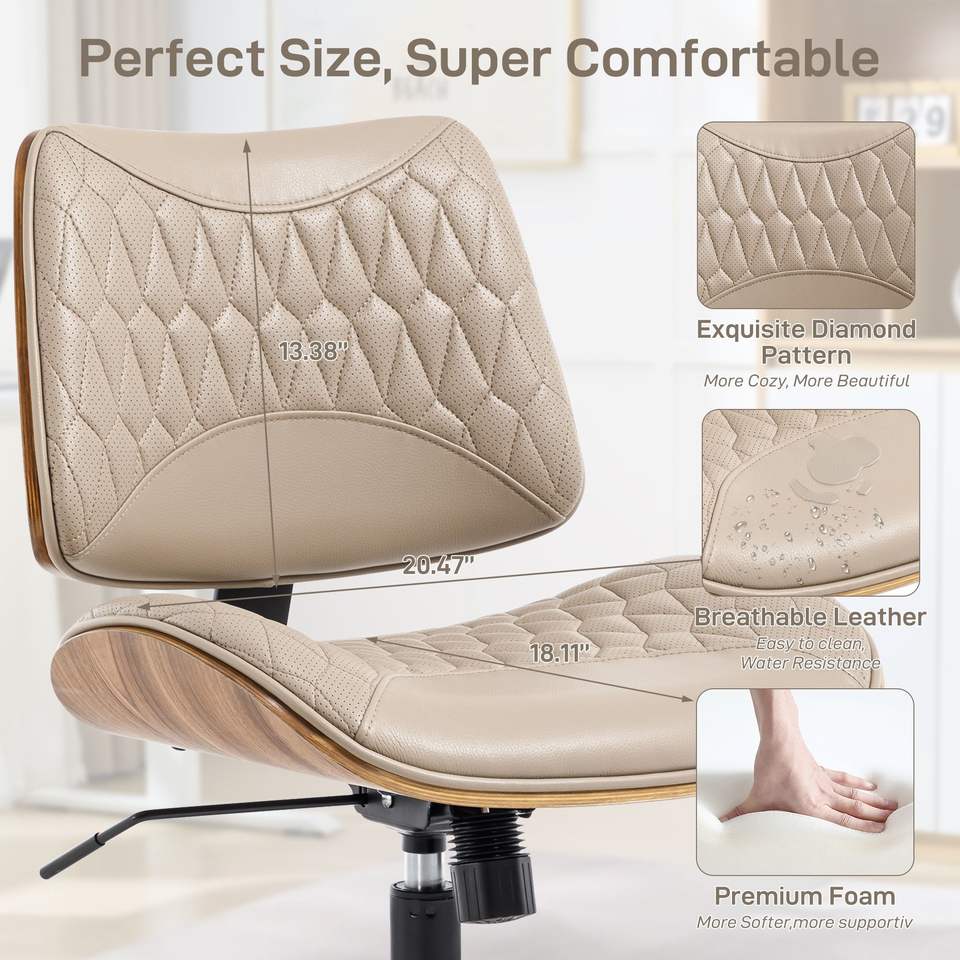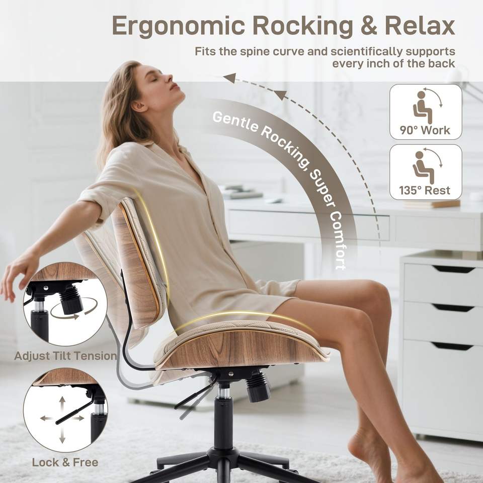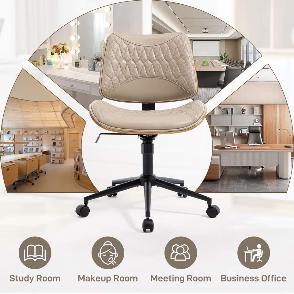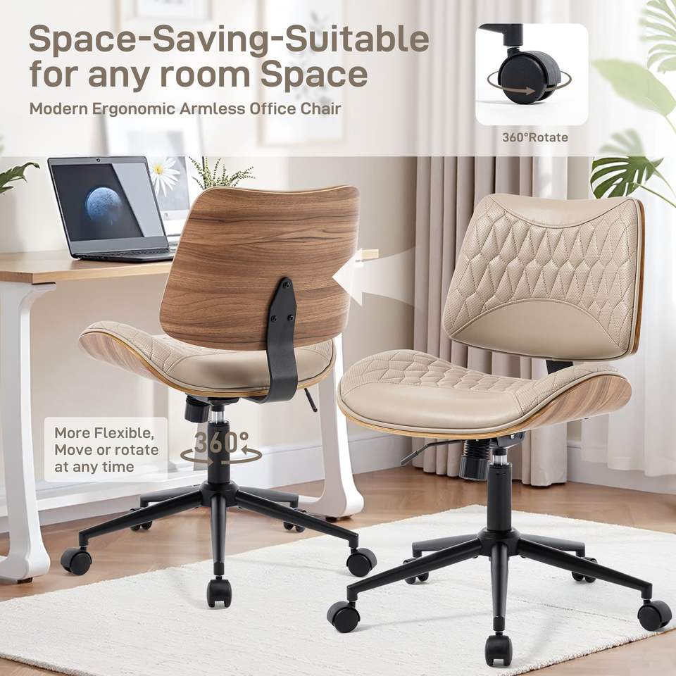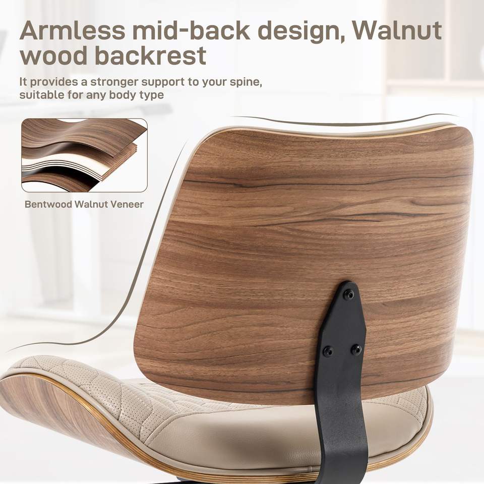 Sedia da Ufficio Girevole Moderna in Noce con Schienale in Legno Curvato e Rivestimento in Pelle PU, Senza Braccioli, Altezza Regolabile, Schienale Medio per Scrivanie Piccole, Stile R
