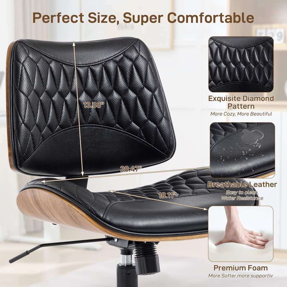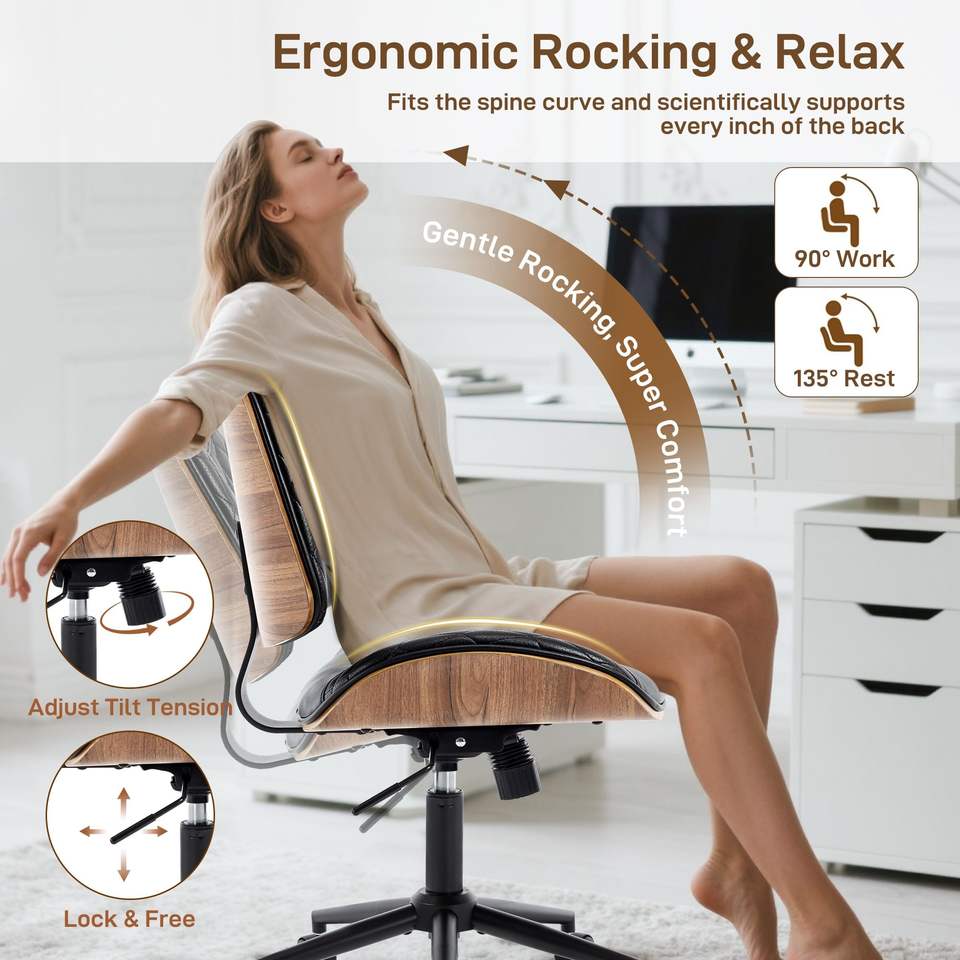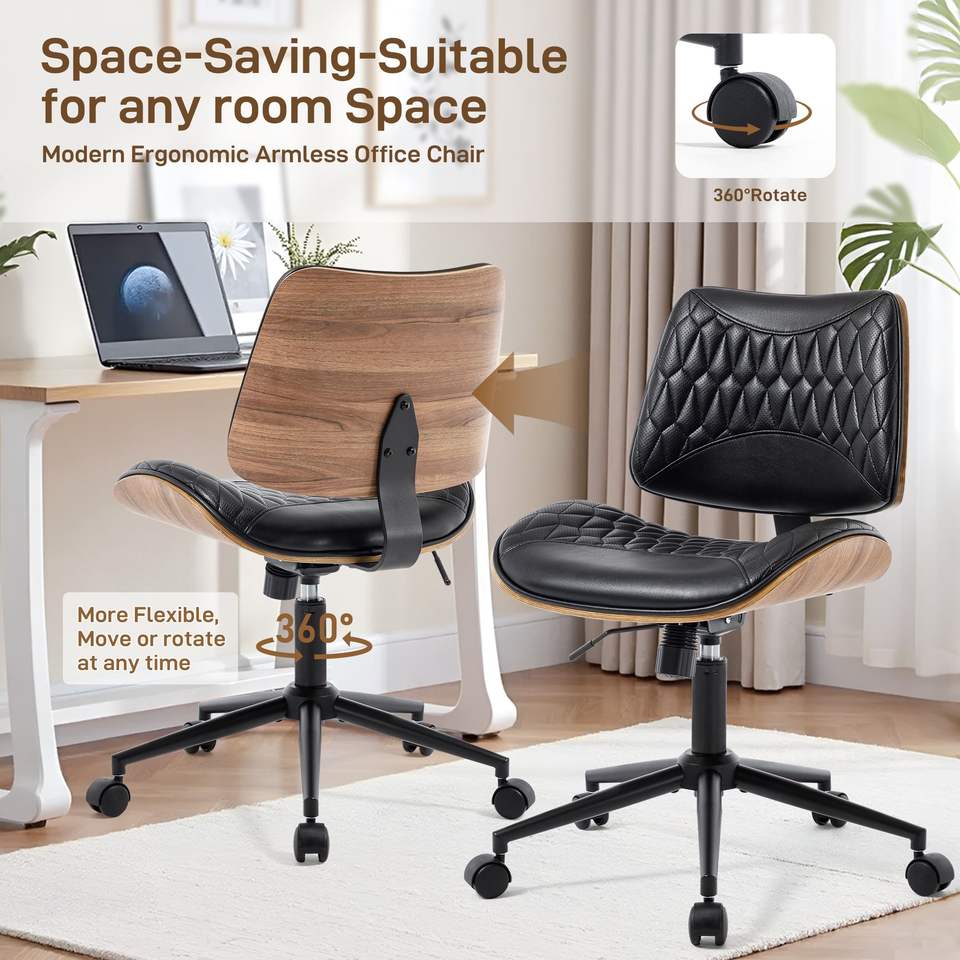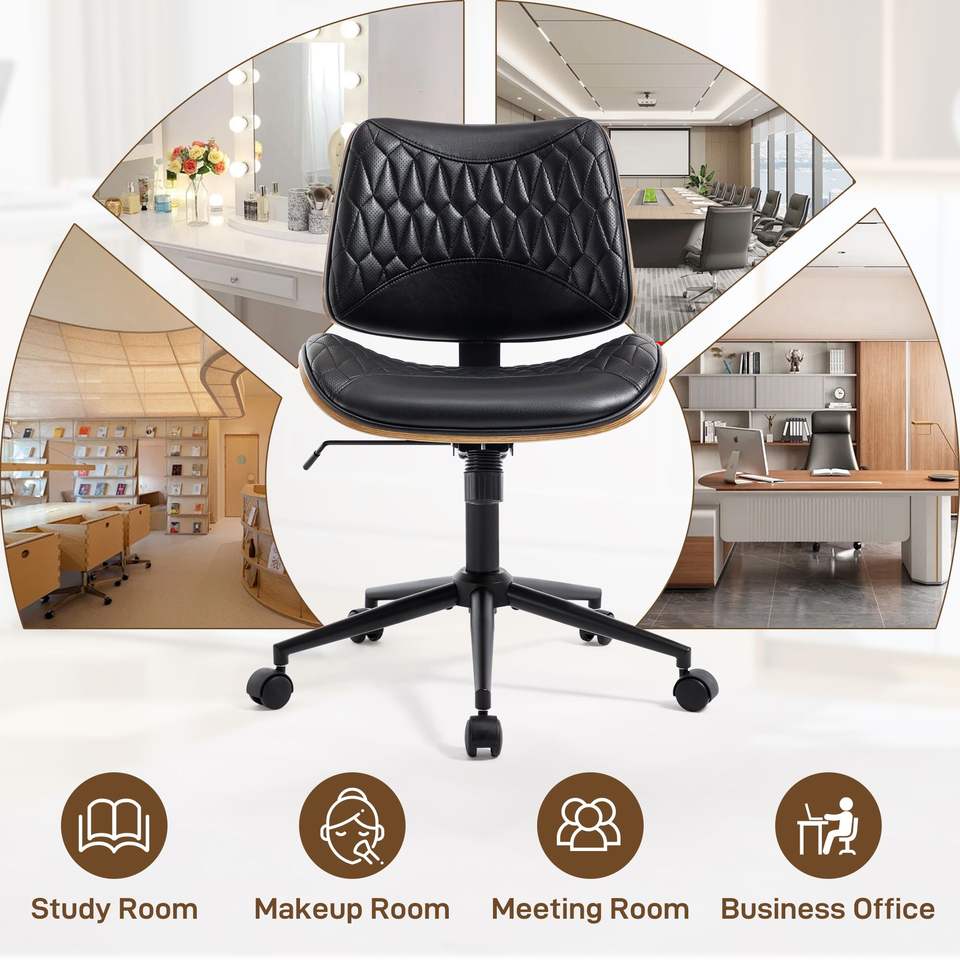 Sedia da Ufficio Girevole Moderna in Noce con Schienale in Legno Curvato e Rivestimento in Pelle PU, Senza Braccioli, Altezza Regolabile e Ruote per Scrivanie Piccole