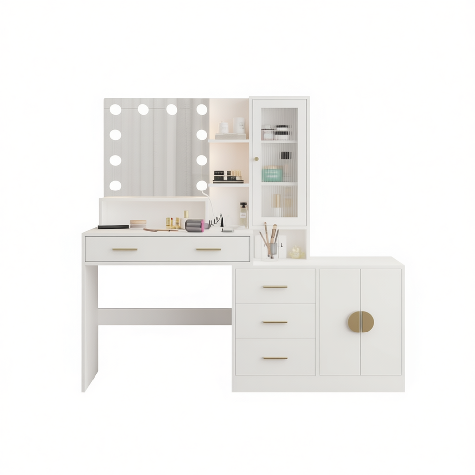 Moderna Scrivania per Trucco Bianca con Specchio Illuminato a LED, Cassetti e Ripiani Portaoggetti Modello D0100HAM9BV