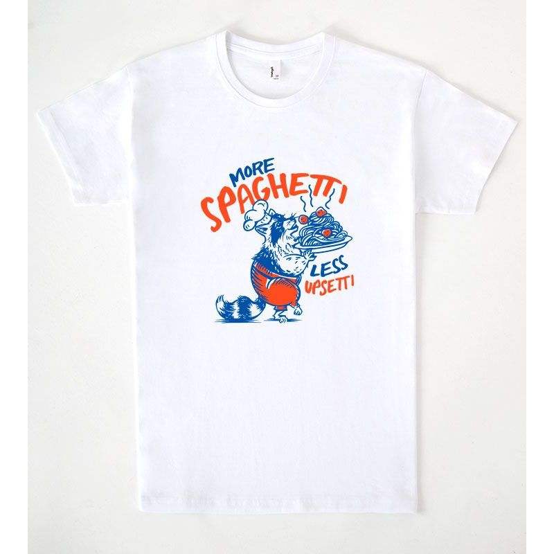 Maglietta promozionale More Spaghetti Less Upsetti bianca per adulti unisex con scollo rotondo e maniche corte