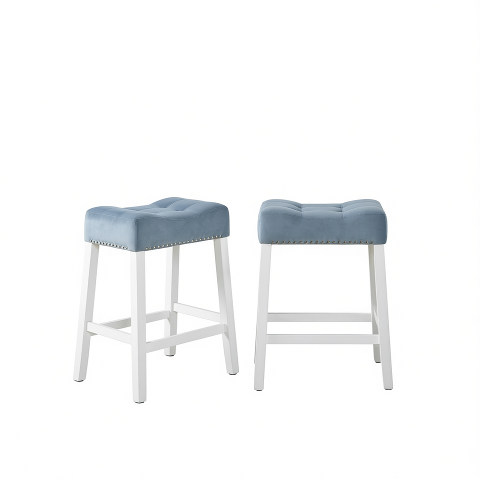Sgabelli da bar Morovo in velluto blu con sedili a sella trapuntati, finitura bianco lavato, altezza bancone, set da 2