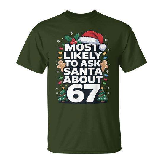 Maglietta con umorismo natalizio per la famiglia: Chi è più probabile che chieda a Babbo Natale 67 cose?
