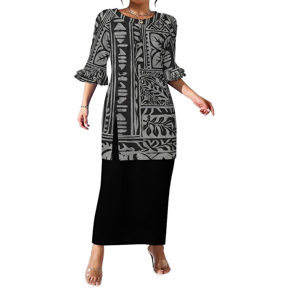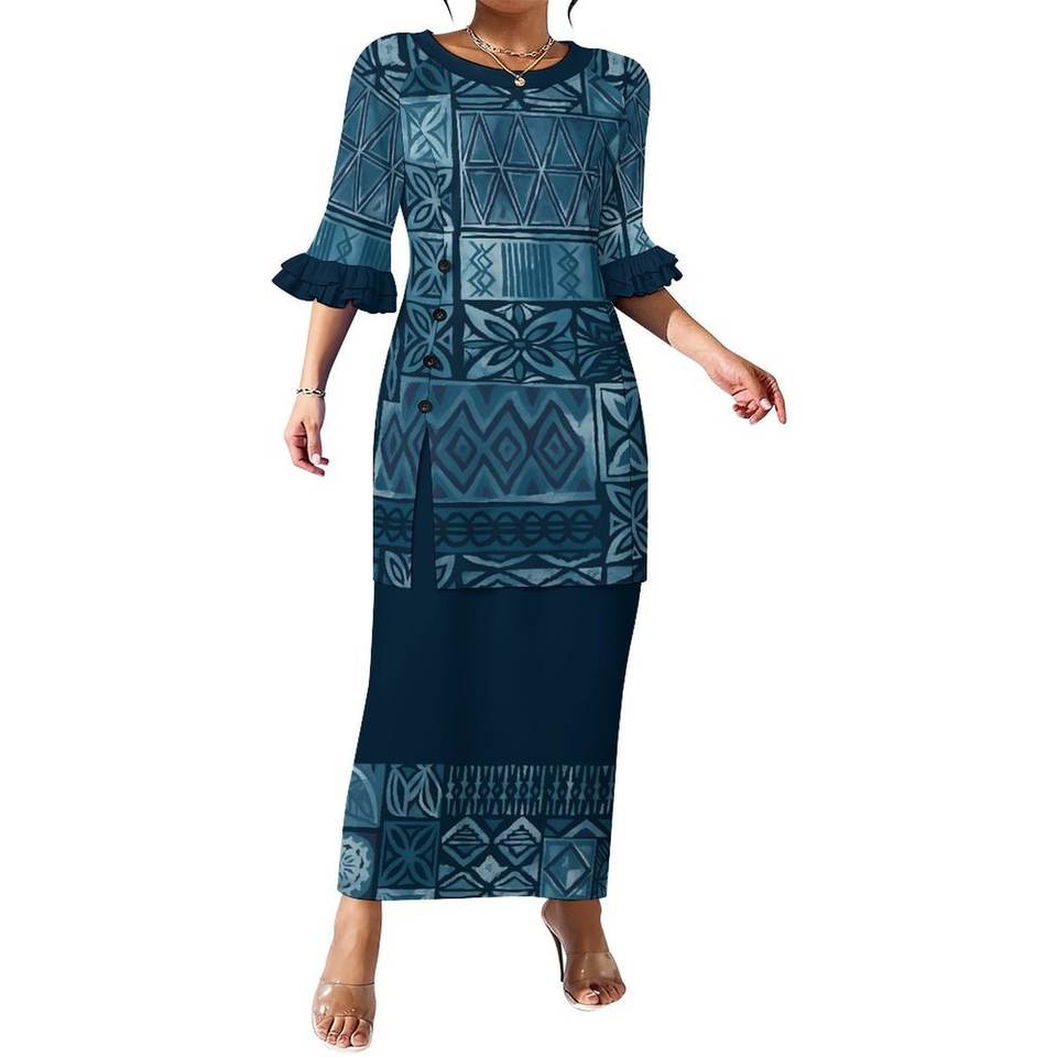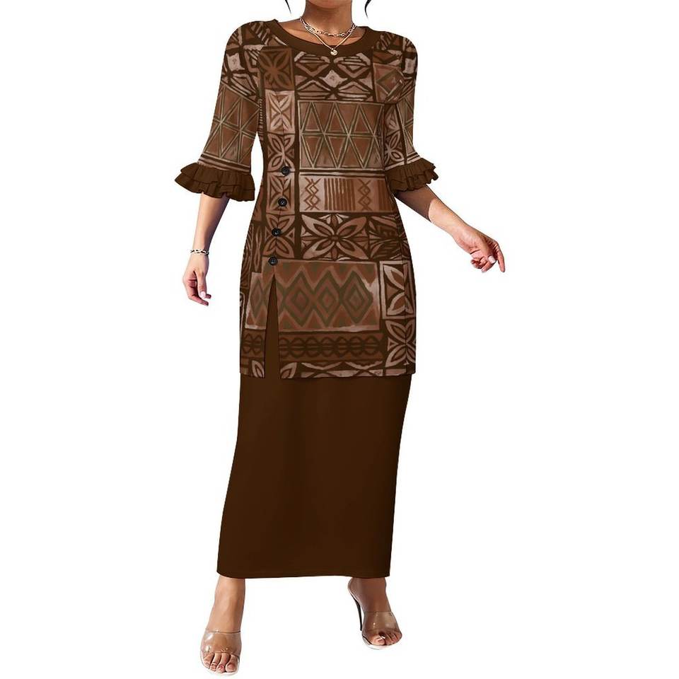 Most Popular Summer Polynesian Elei Tribal Design Custom Casual Party Dress Women Round-neck Button-up Two-2 Piece Set Puletasi