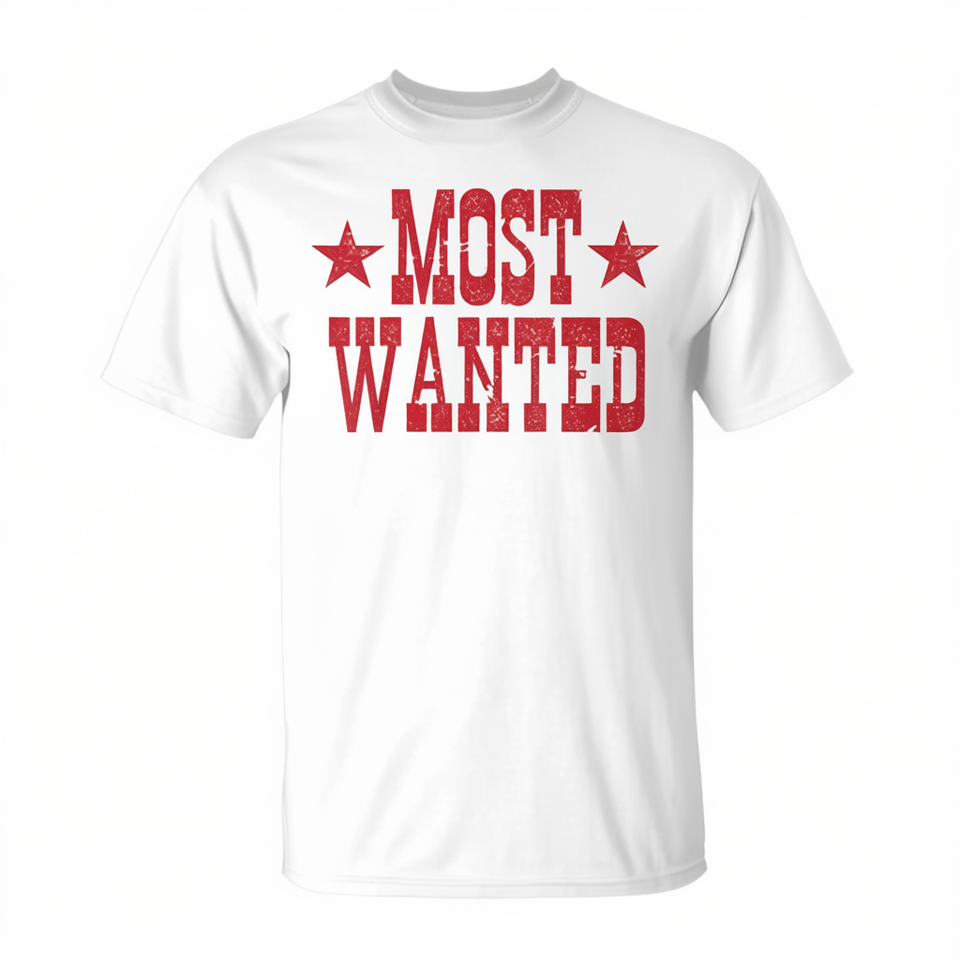 T-shirt Most Wanted bianca con testo rosso e design a stella, vestibilità unisex