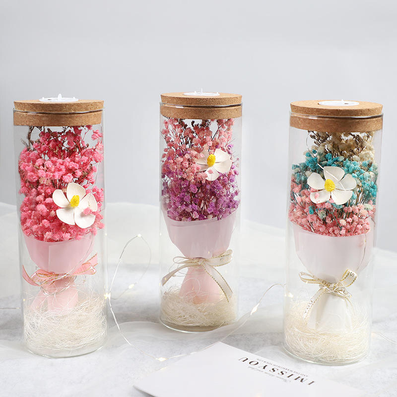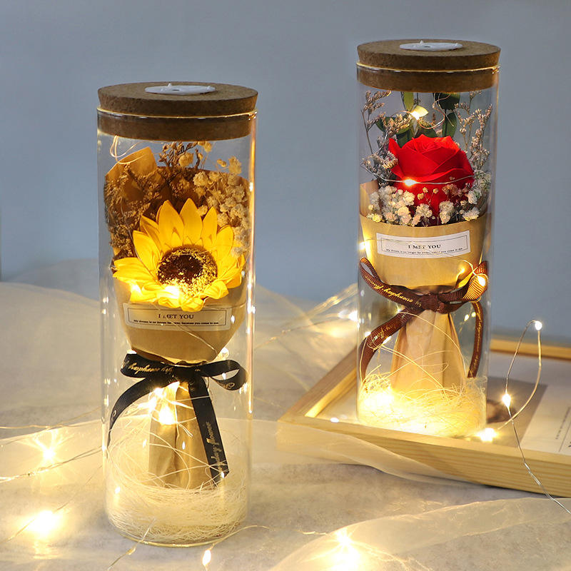 Mother's Day/Valentine's Birthday Gift Gypsophila Sunflower Rose Carnation Immortal Bouquet Preserved Dried Flowers Glass Vase
