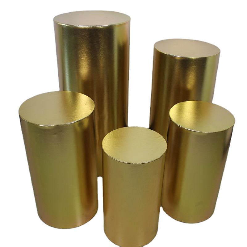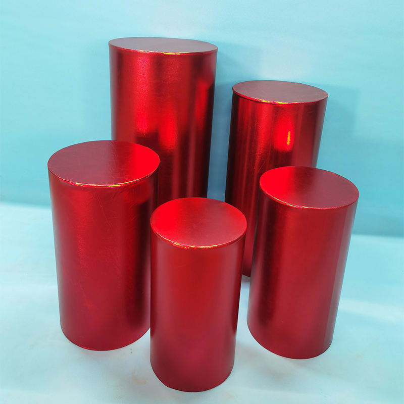 Piedistallo multicolore oro rosso lucido copertura in tessuto metallico piedistallo elastico coperture cilindriche bianche per la decorazione della festa