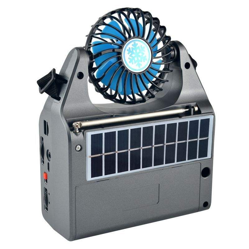 Solar charging, cooling fan, radio, long battery life, portable strap