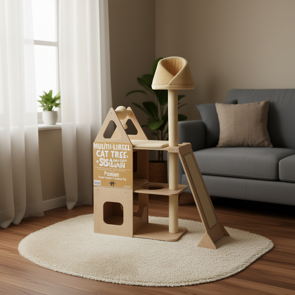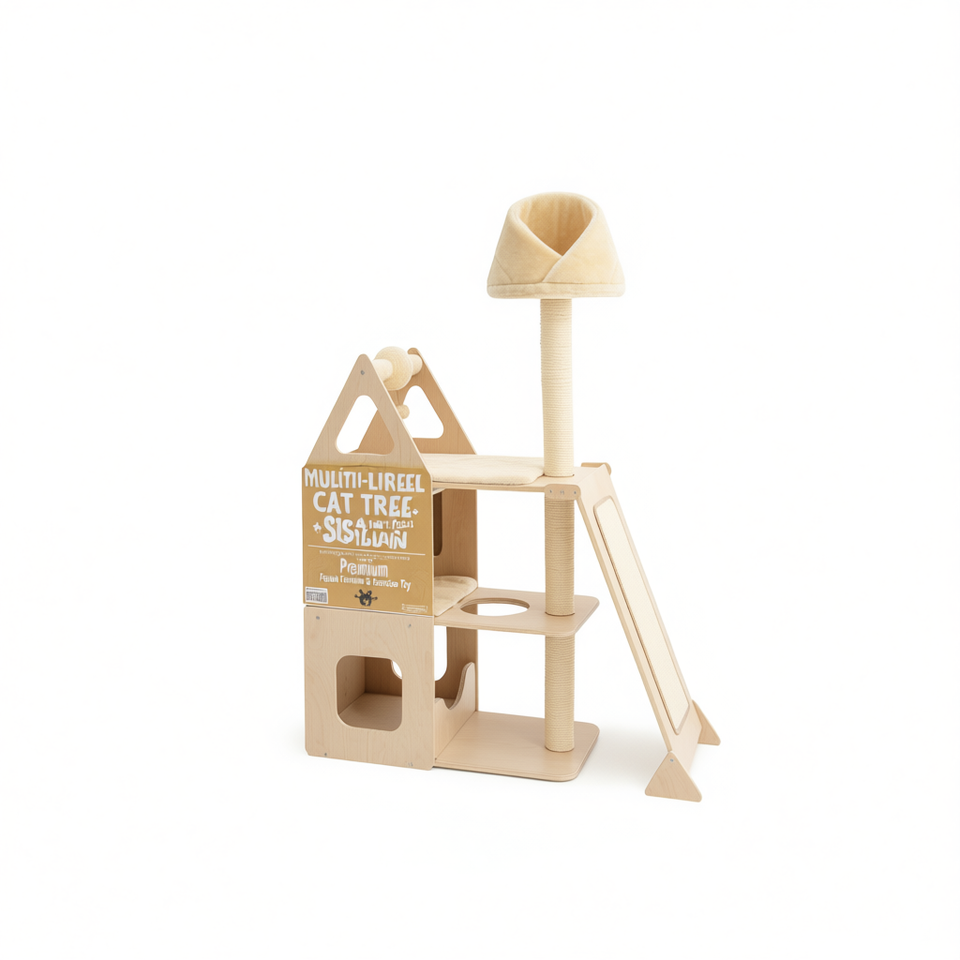 Multi-Level Cat Tree With Sisal Scratching Post Premium Feline Furniture Exercise Toy For Cats Indoor Modern Style Beige