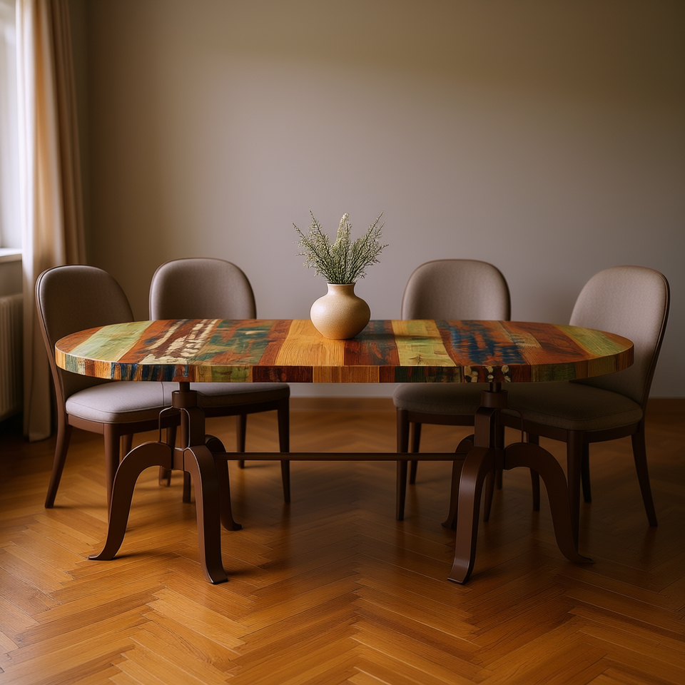 Multicolor Reclaimed Wood Oval Dining Table Brown Steel Legs Rustic Modern Design Handmade Home Furniture
