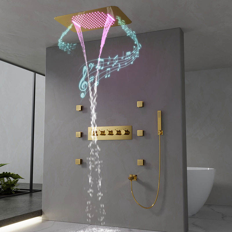 Set Doccia Termostatico Multifunzione Dorato per Bagno, con Soffione Musicale a Soffitto, Effetto Pioggia e Massaggio, per Ingrosso