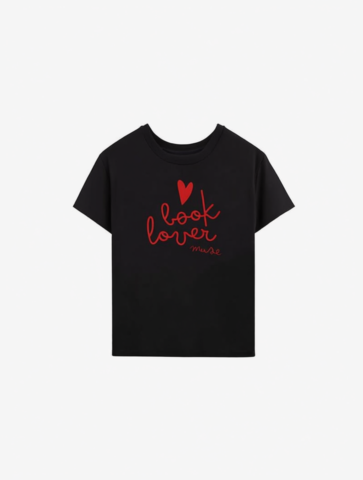 Muse Black Round Neck T-Shirt Short Sleeve Loose Fit Heart Detail Printed Casual Spring Summer Women's T-Shirt