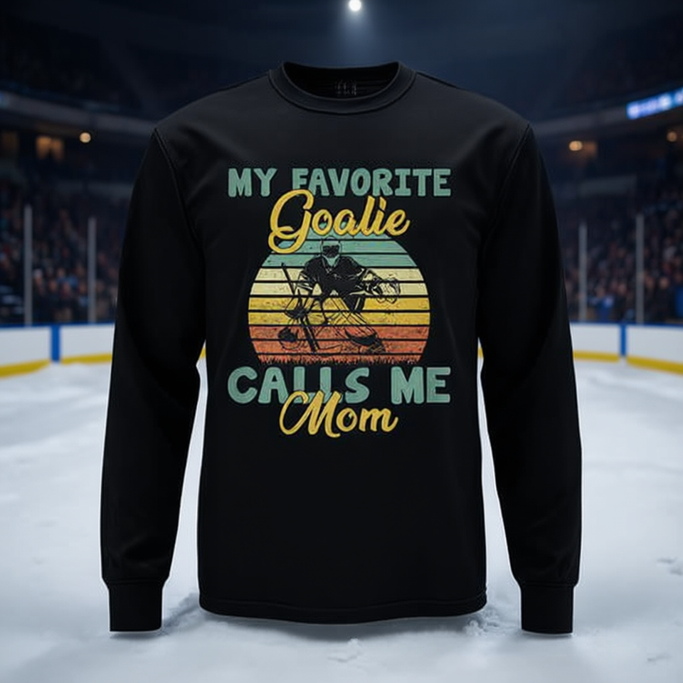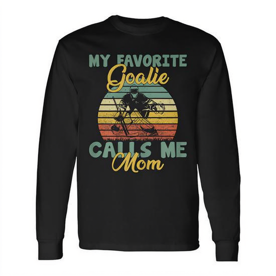Maglietta a maniche lunghe con stampa 'My Favorite Goalie Calls Me Mom' per mamma di giocatore di hockey su ghiaccio, abbigliamento per sport invernali