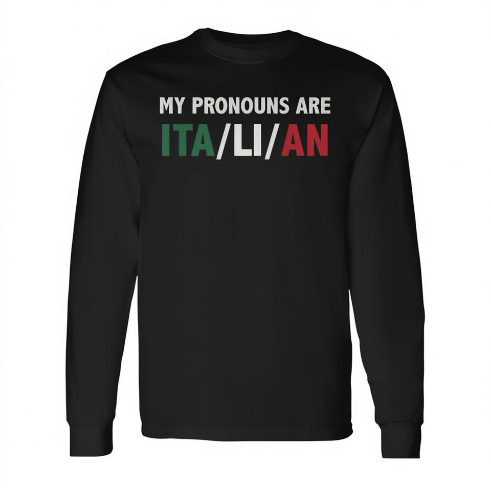 I miei pronomi sono quelli della bandiera italiana, maglietta a maniche lunghe, radici di orgoglio italiano
