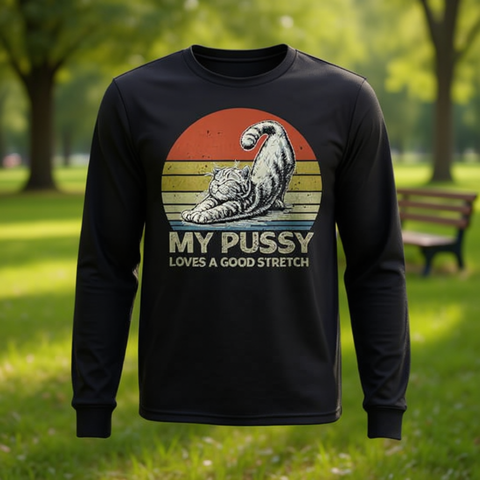 Maglietta a Maniche Lunghe Unisex con Stampa Serigrafica 'My Pussy Loves A Good Stretch Cat' per Attività Promozionali