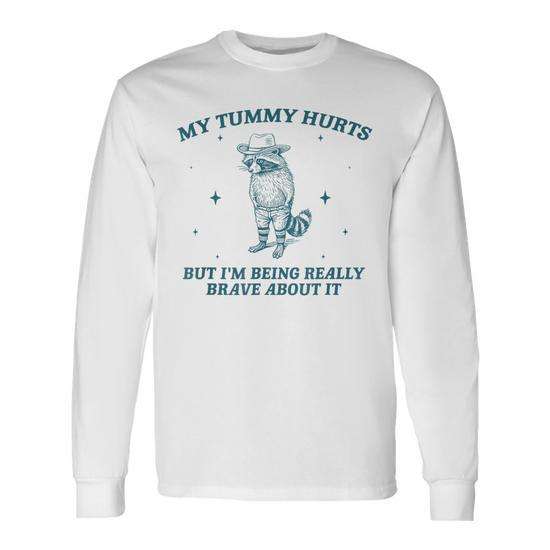 Il mio stomaco fa male ma sto facendo finta di essere coraggioso. T-shirt a maniche lunghe Cowboy Raccoon circa IT