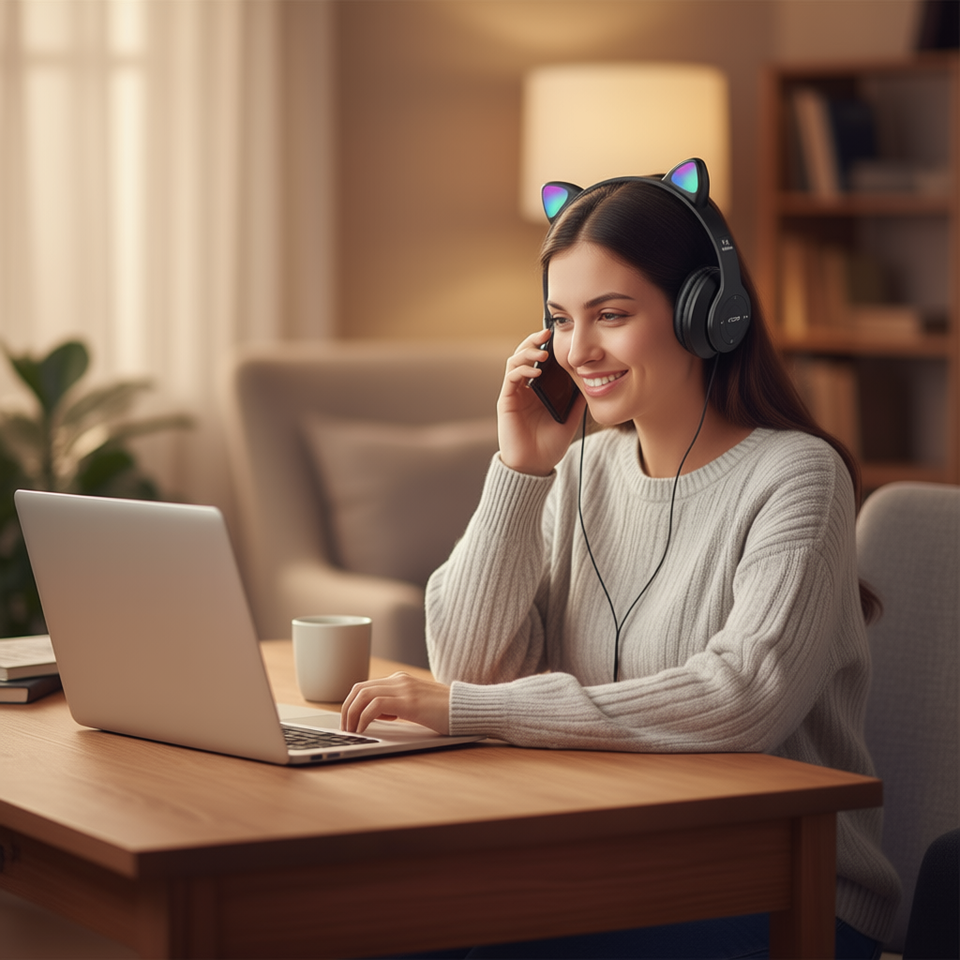 Cuffie Myrva Cat Ear wireless over-ear per musica, gaming e chiamate con effetti luminosi a LED