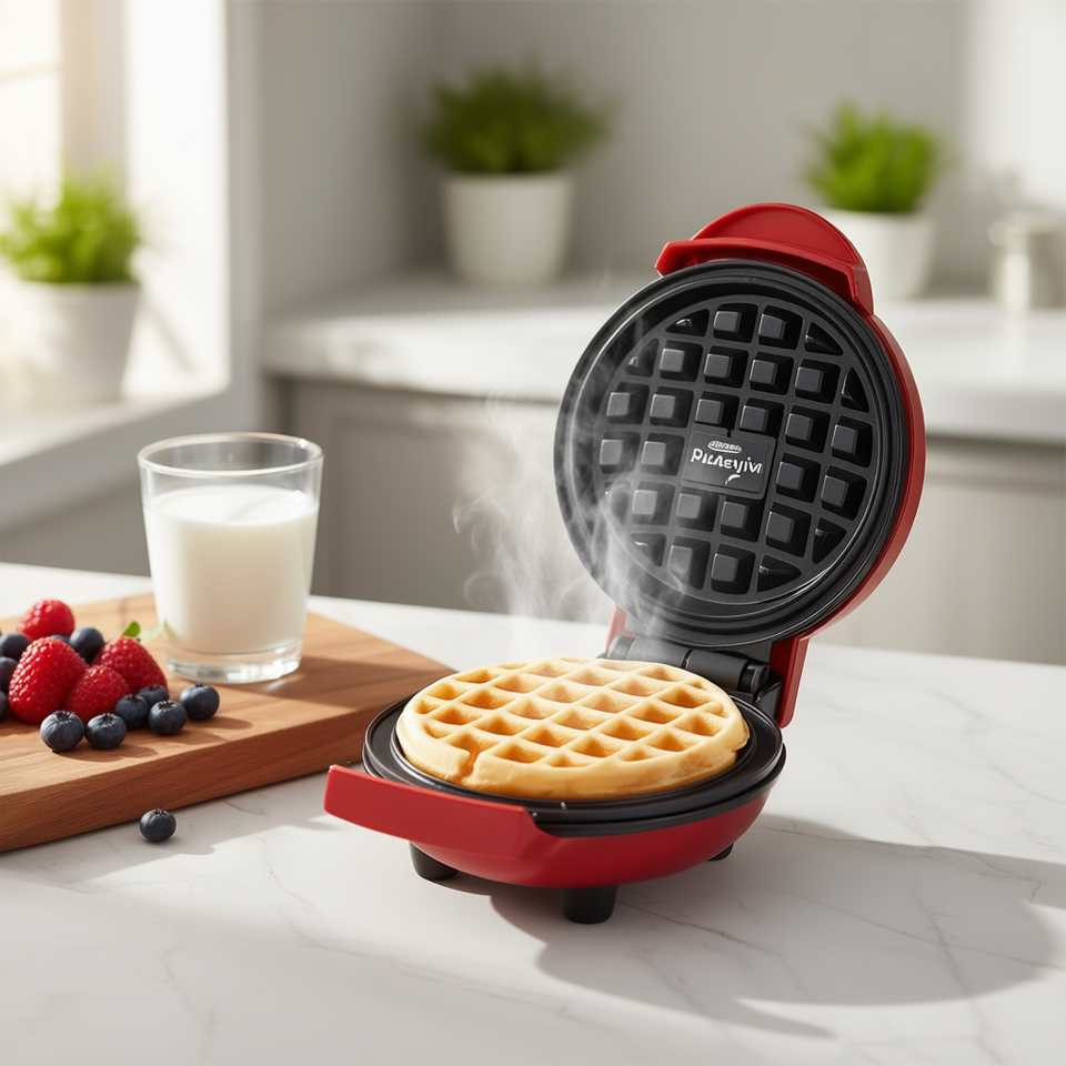 Myrva Mini Piastra Elettrica per Waffle 1000W in Acciaio Inossidabile con Piastre Antiaderenti Design Rotondo Elettrodomestico