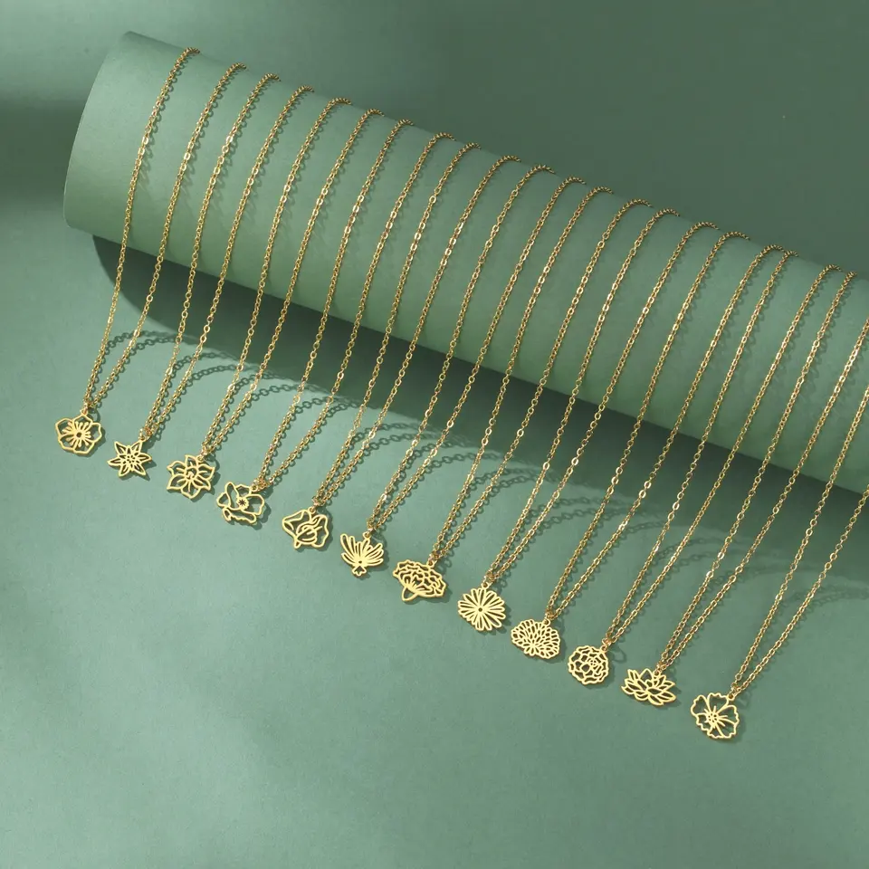Myshape Birth Month Flowers Pendant Necklace Women Girls Stainless Steel Poppy Aster Lotus Daffodil Jewelry Birthday Gift