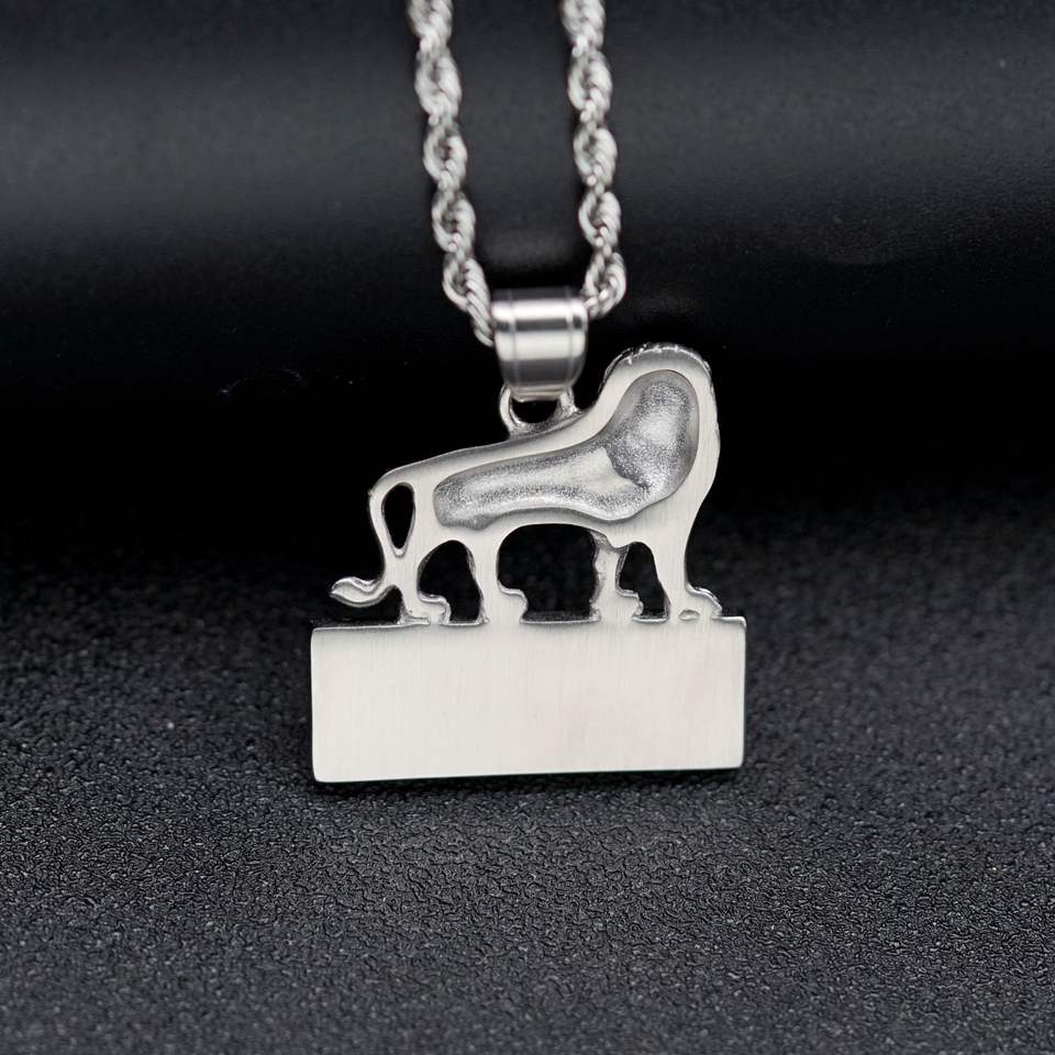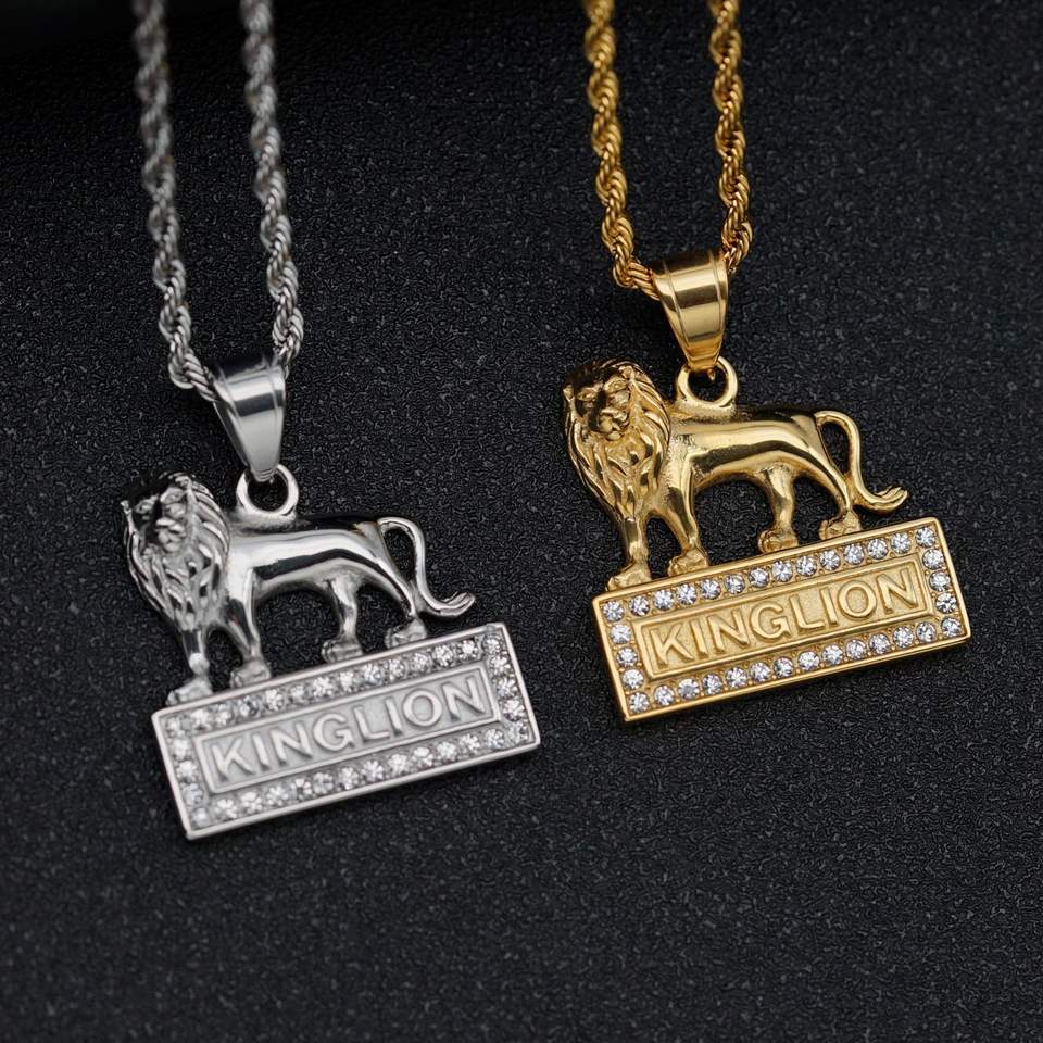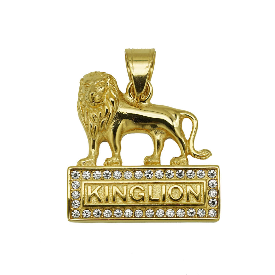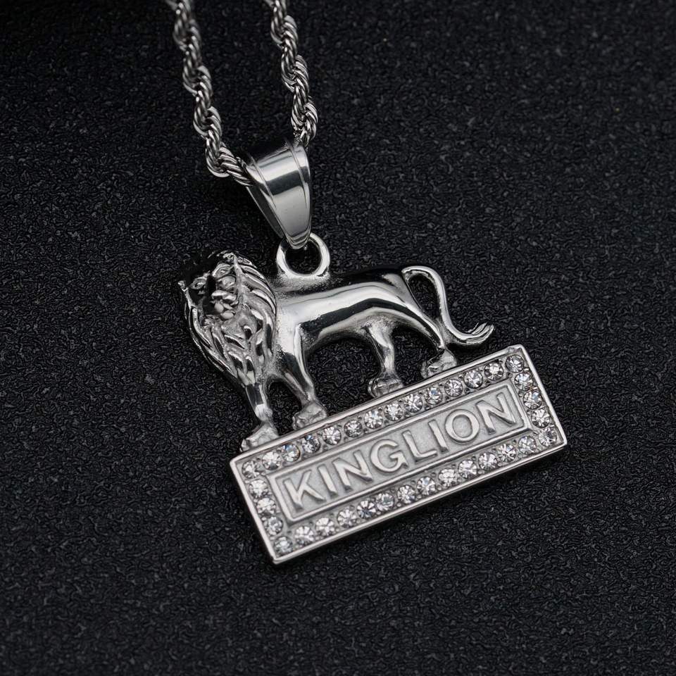 Collana con Placca Rettangolare con Scritta KINGLION e Leone Scolpito 3D Intricato e Mitico, con Zirconi Cubici