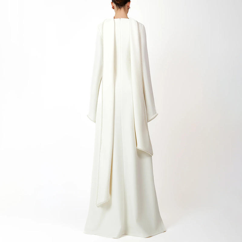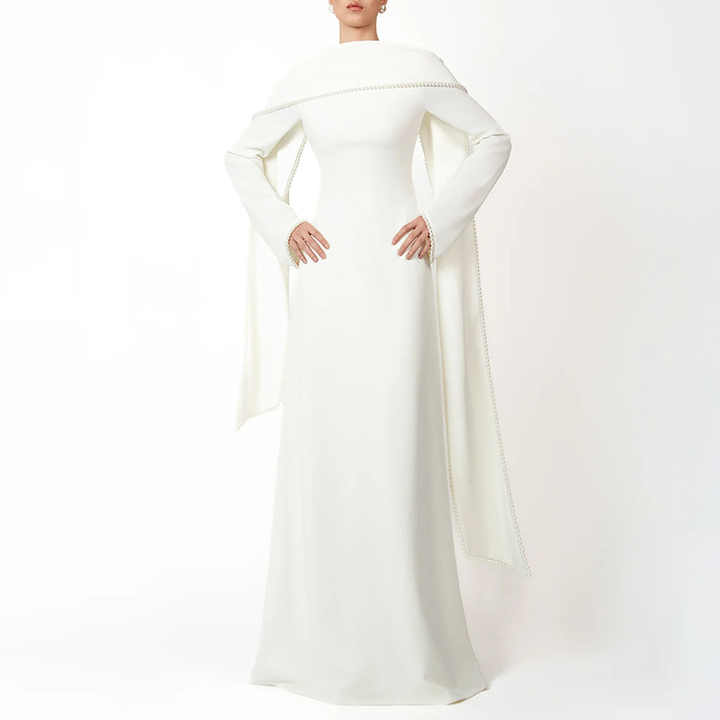 Abito da sera lungo elegante e lussuoso con perline, dettaglio scialle e maniche a mantella impreziosite da perle, stile francese raffinato