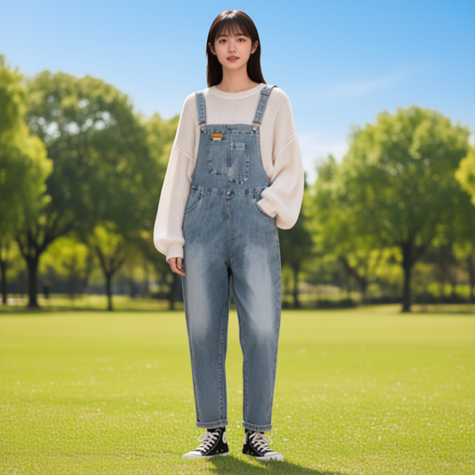 N067 Women's Denim Overalls Mid Waist Loose Fit Stonewashed Cotton Casual Spring Style With Pockets