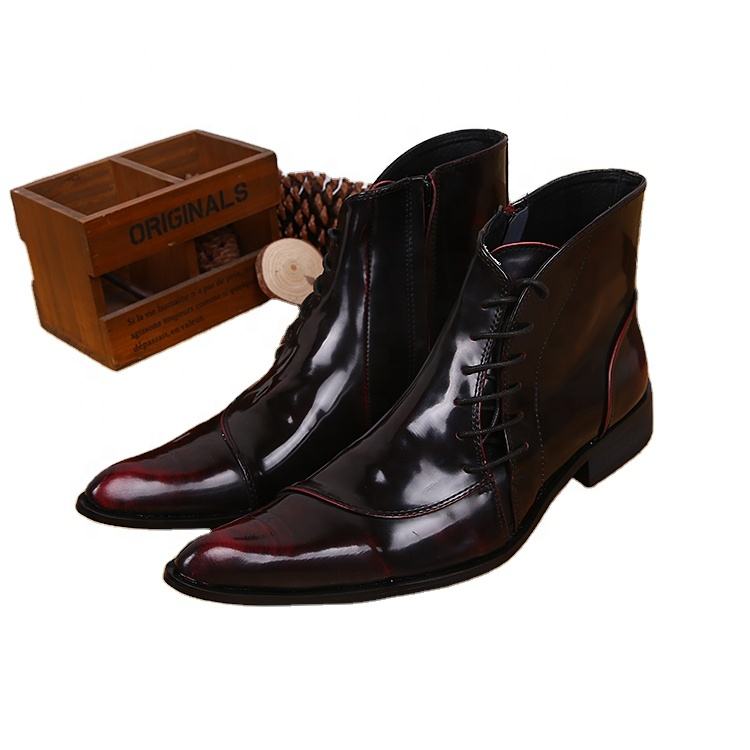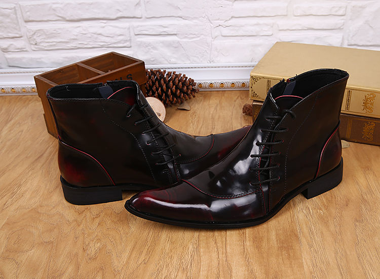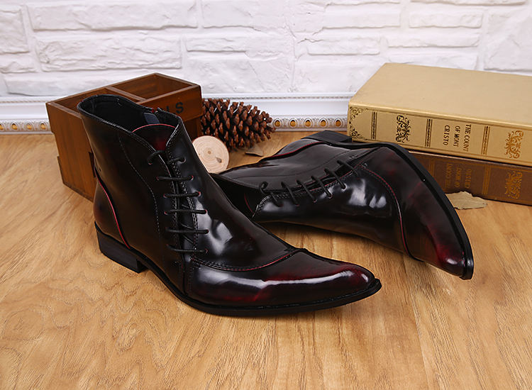 NA032 Stivali alla Caviglia da Uomo in Vera Pelle Rosso Vino con Cerniera Laterale e Lacci, Stivali da Cowboy con Punta Affusolata