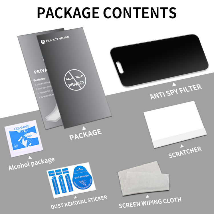 1 piece privacy filter+OPP bags+12*18 cm clean cloth+ instructions+individual retail package.