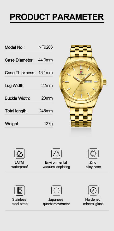 NAVIFORCE 9203 GG Nuovo Orologio Dorato da Uomo Design Originale in Acciaio Inossidabile Orologio da Polso al Quarzo Impermeabile Regalo alla Moda