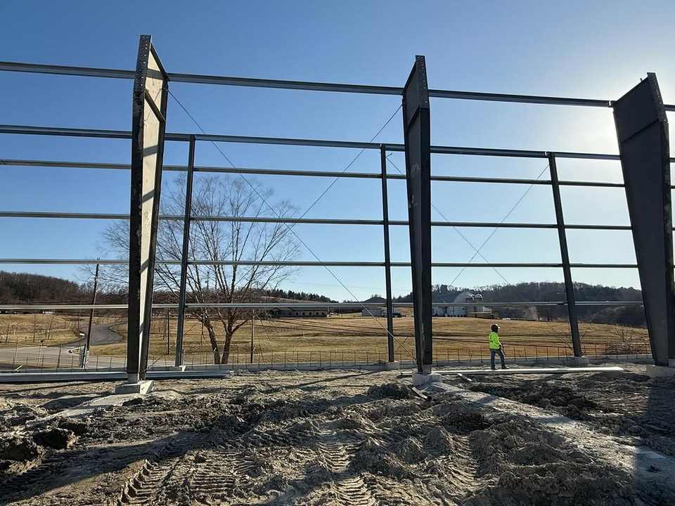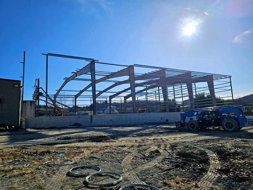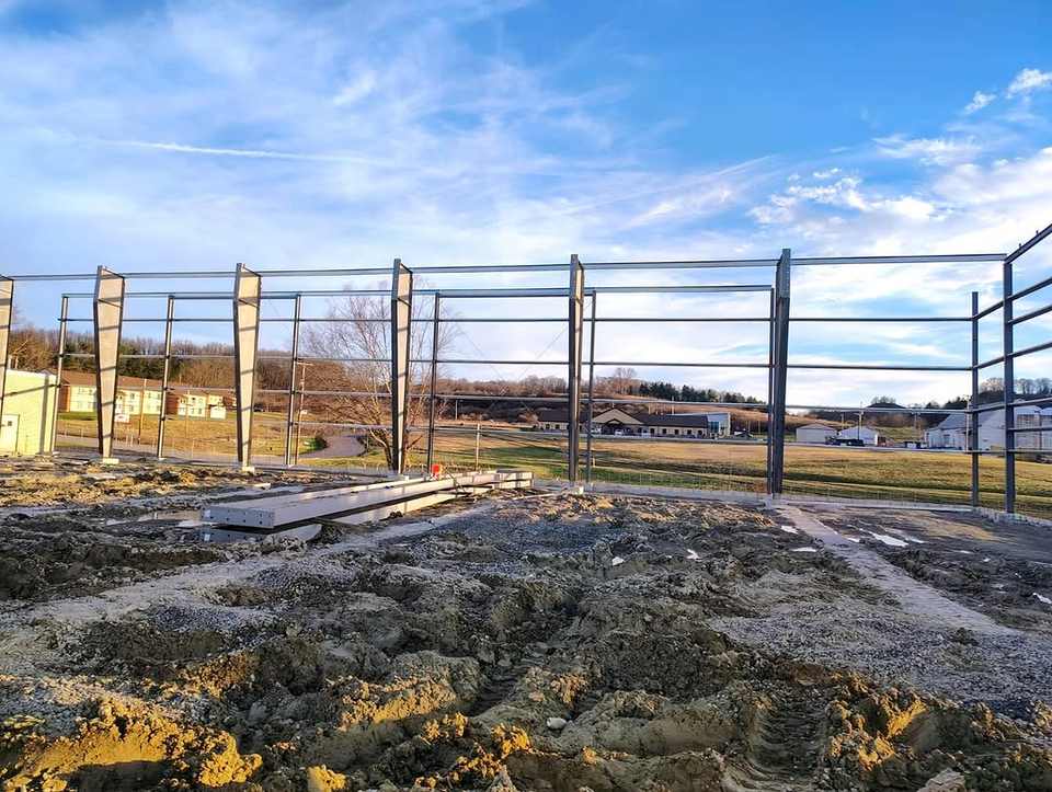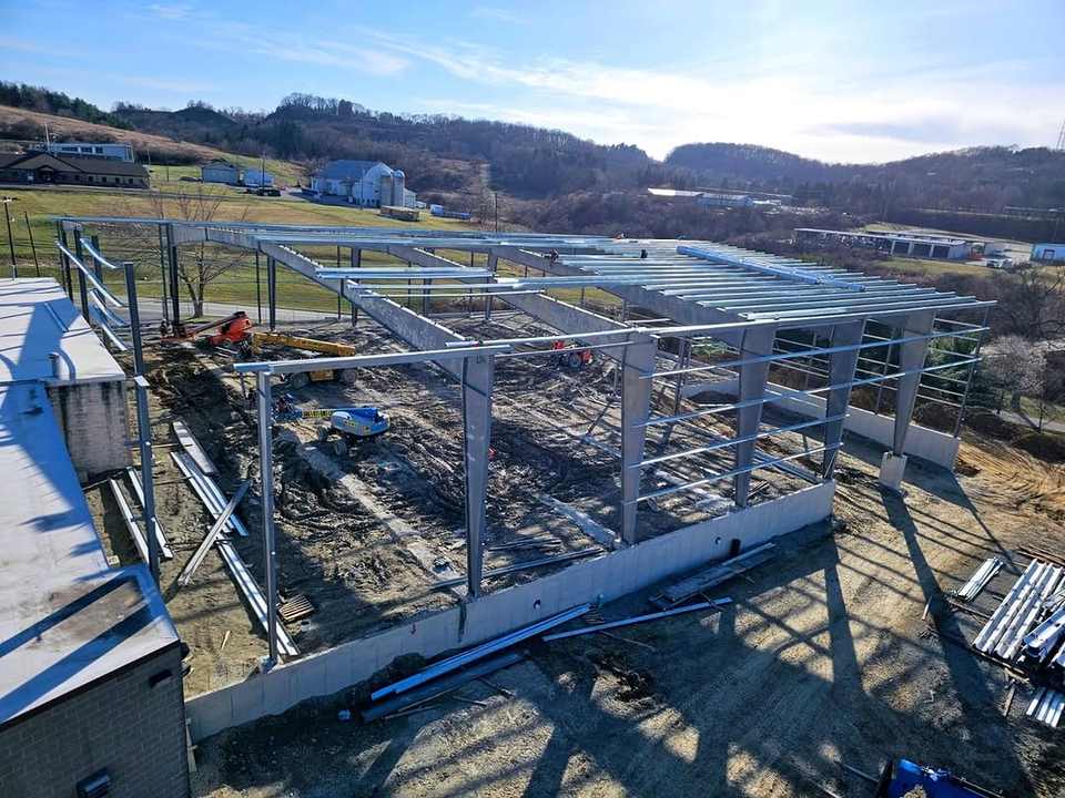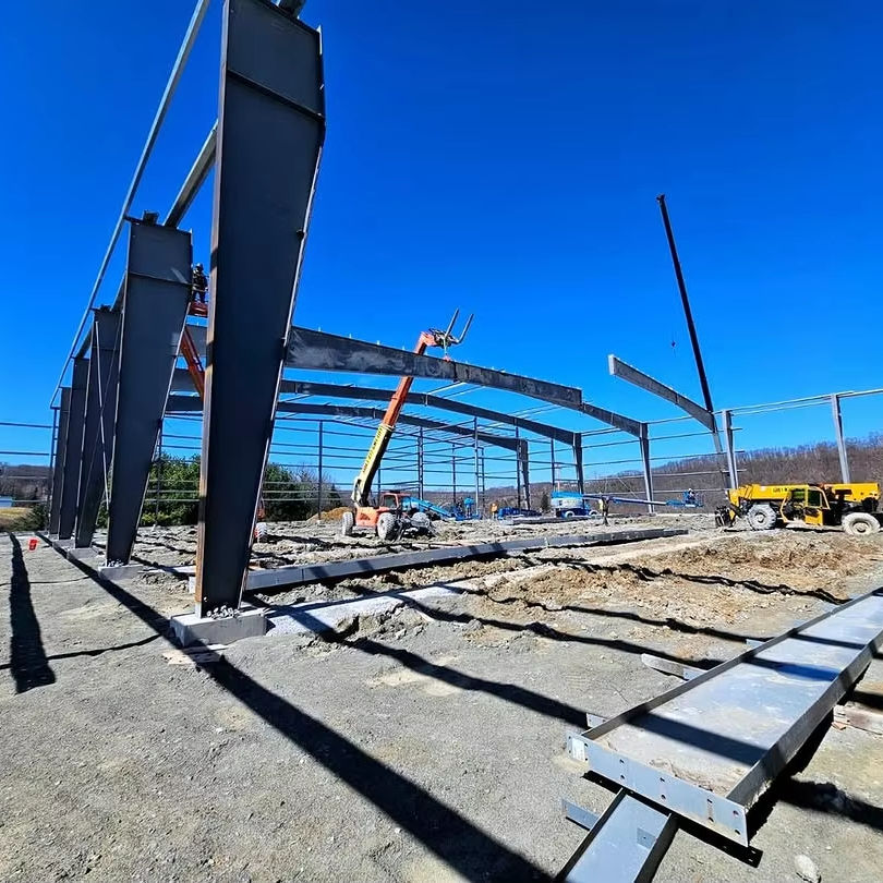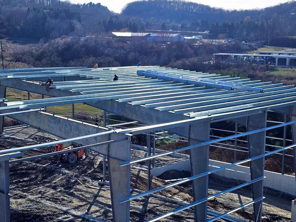 Nuovo nuovo progetto di espansione della fabbrica che erige colonne e montanti di gronda con inquadratura installazione in corso colonne Girts installati
