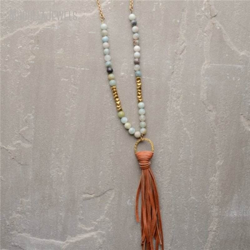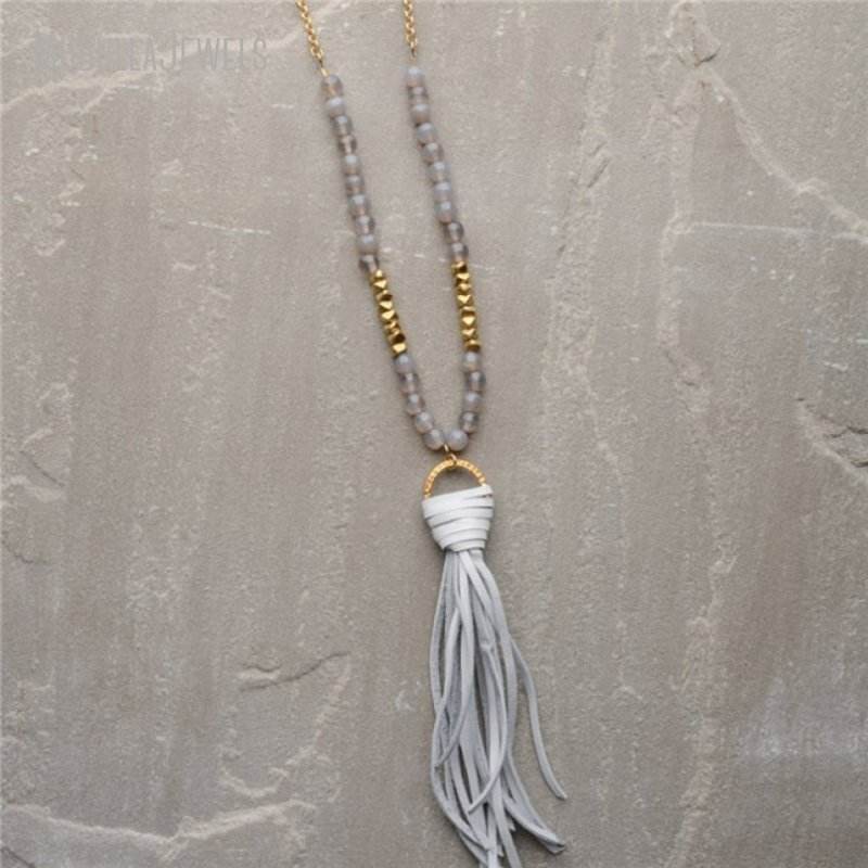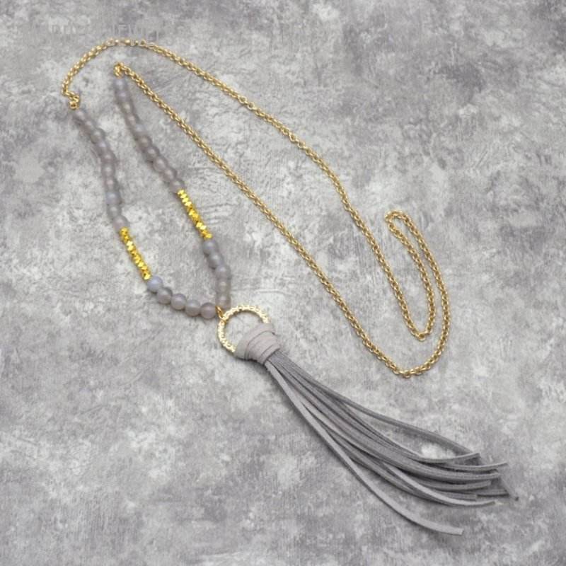 NM20672 Bohemian Quartz Beaded Necklace with Long Tassel and Gold Plated Chain Pendant Gemstone Style Necklace