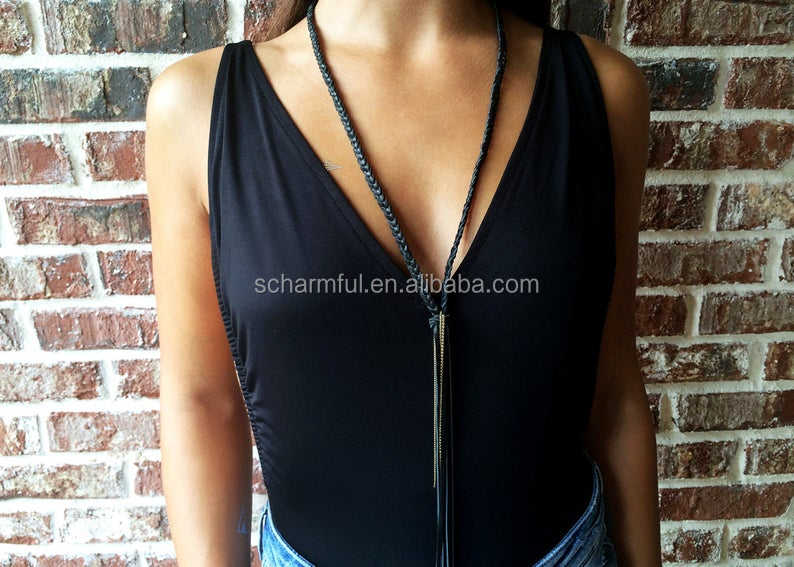 NS190907 collana in ecopelle con perline nere intrecciate lunghe con catena d'oro