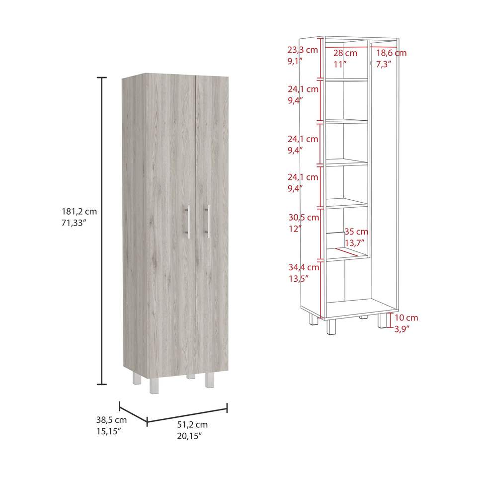 Armadio a due ante Nala grigio chiaro/bianco con quattro gambe e cinque ripiani per utensili di pulizia e scaffali multiuso