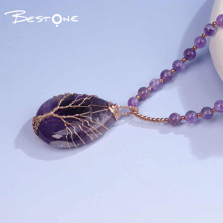 Collana con Pendente in Ametista Naturale e Quarzo Rosa, Filo di Rame Avvolto, Collana Rosario con 108 Perline, Gioielli Reiki per Donne
