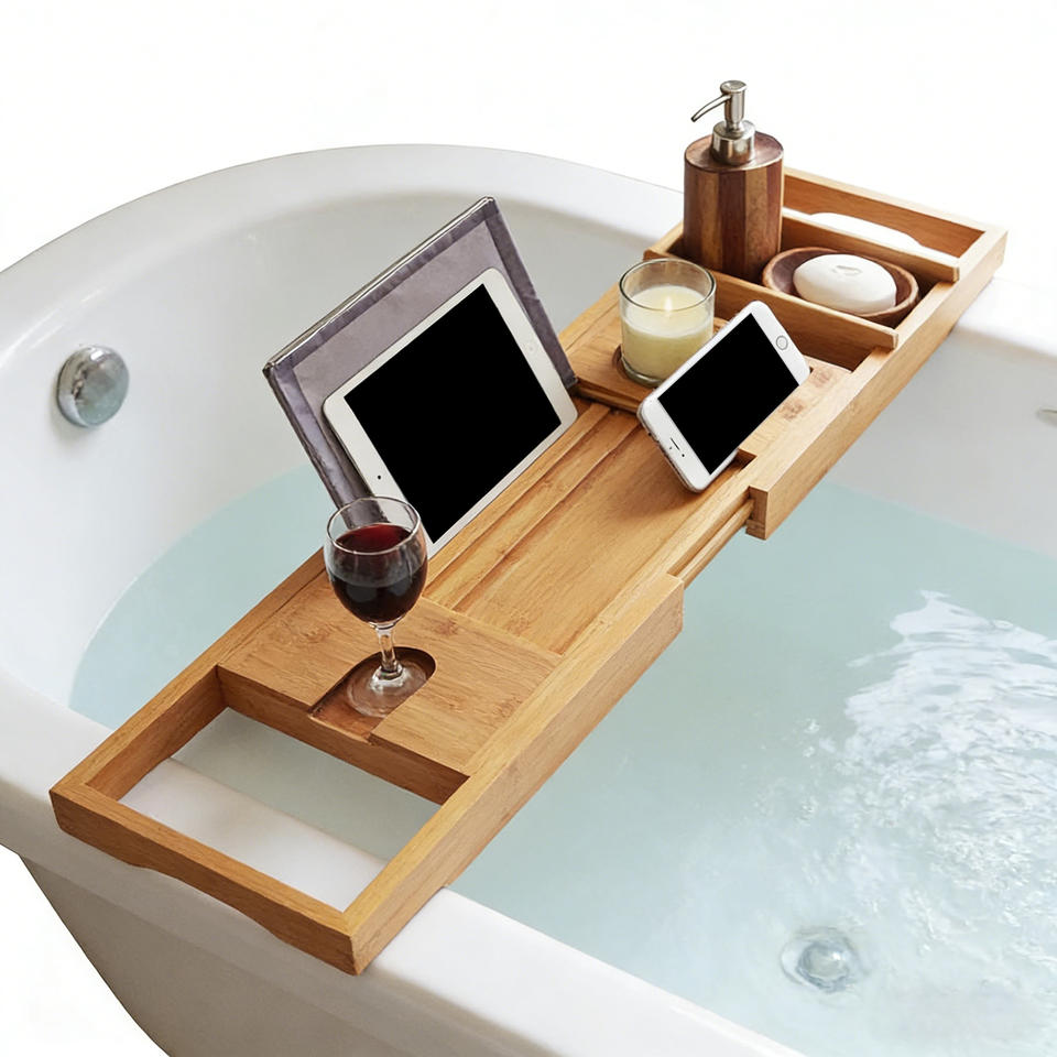 Naturale di Bambù Vasca Da Bagno Caddy con Estendere I Lati Espandibile Doccia Vasca da bagno Vassoio Rack Con Panno Impermeabile