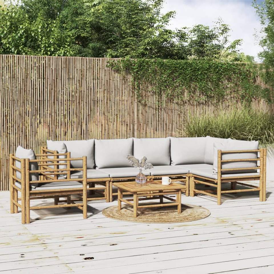 Set Lounge da Giardino in Bambù Naturale con Cuscini Grigio Chiaro per Arredamento da Esterno
