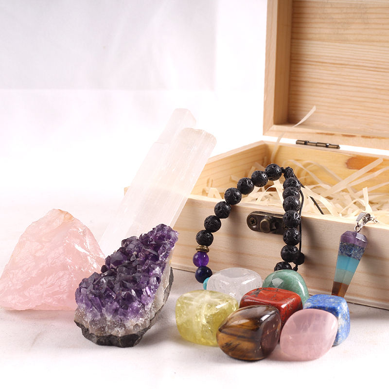 Natural Crystal Polished Tumbled Stones 7 Chakra Healing Set Folk Art Design Wooden Box Meditation Gift Kit