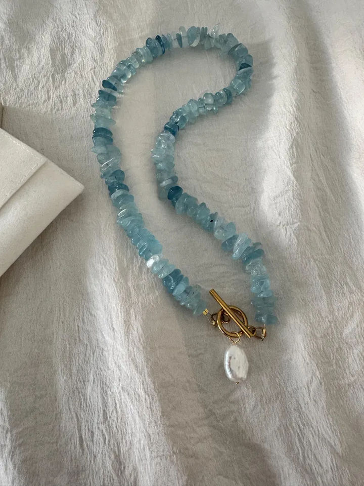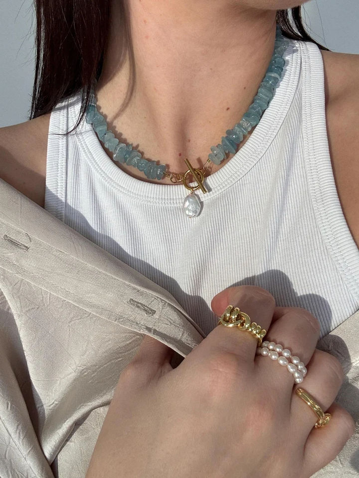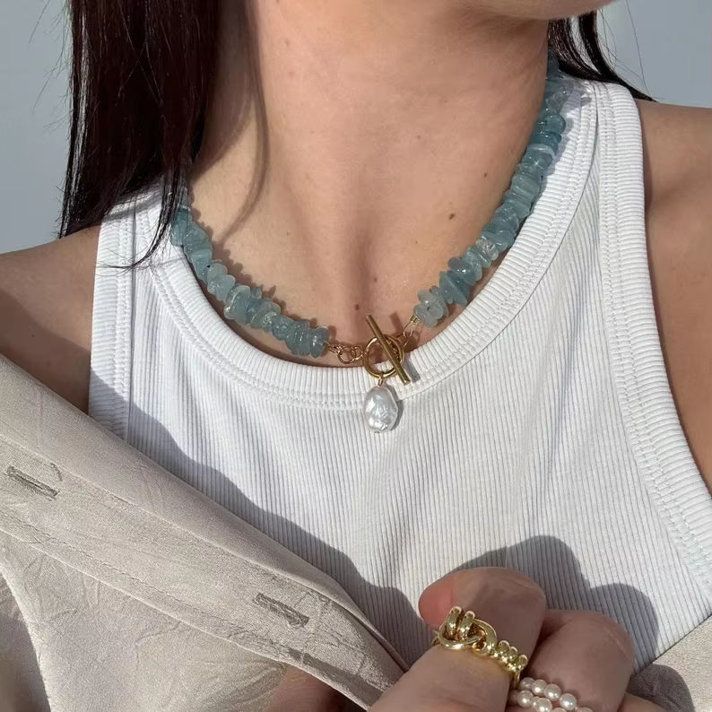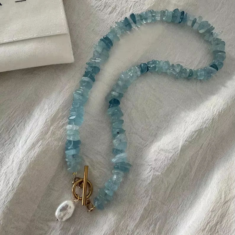 Natural Healing Aquamarine Stone Freshwater Pearl Charm Choker Fashion Necklace for Women
