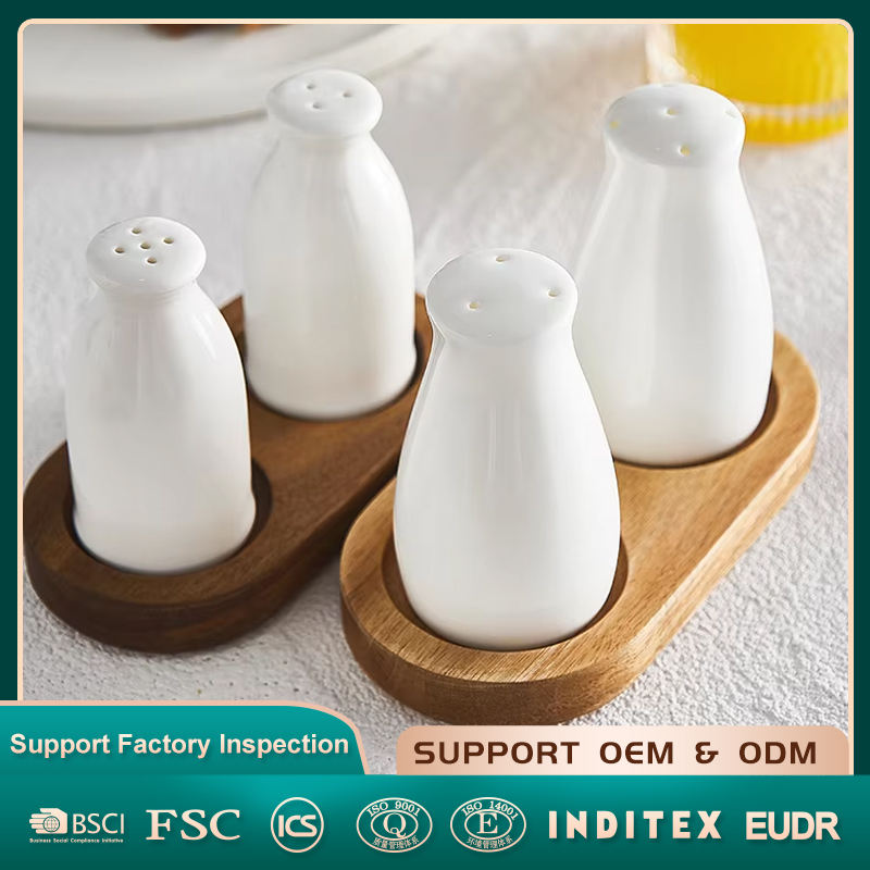 Natural House Wholesale White Ceramic Salt and Pepper Shakers Set with Acacia Wood Holder for Home Restaurant