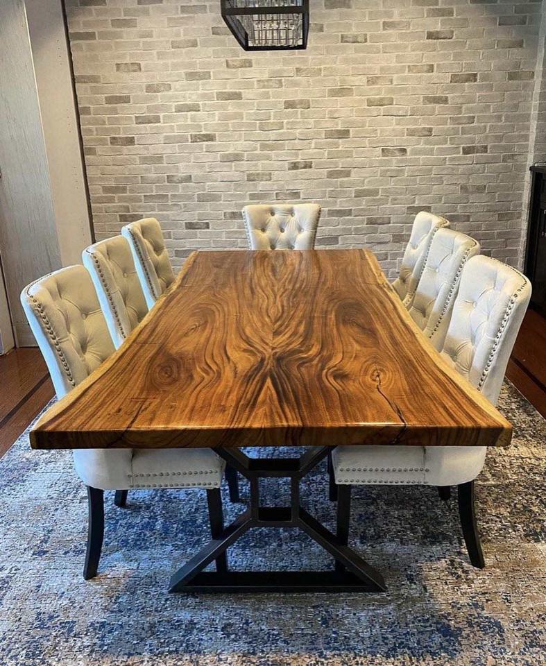Tavolo da Pranzo in Legno Massello Naturale con Gambe in Metallo Nero, Tavolo con Bordo Naturale in Noce Sudamericano, Disponibile in Stock, Lastre di Legno Essiccate in Forno