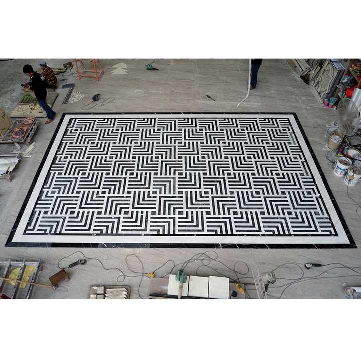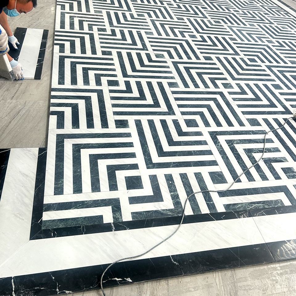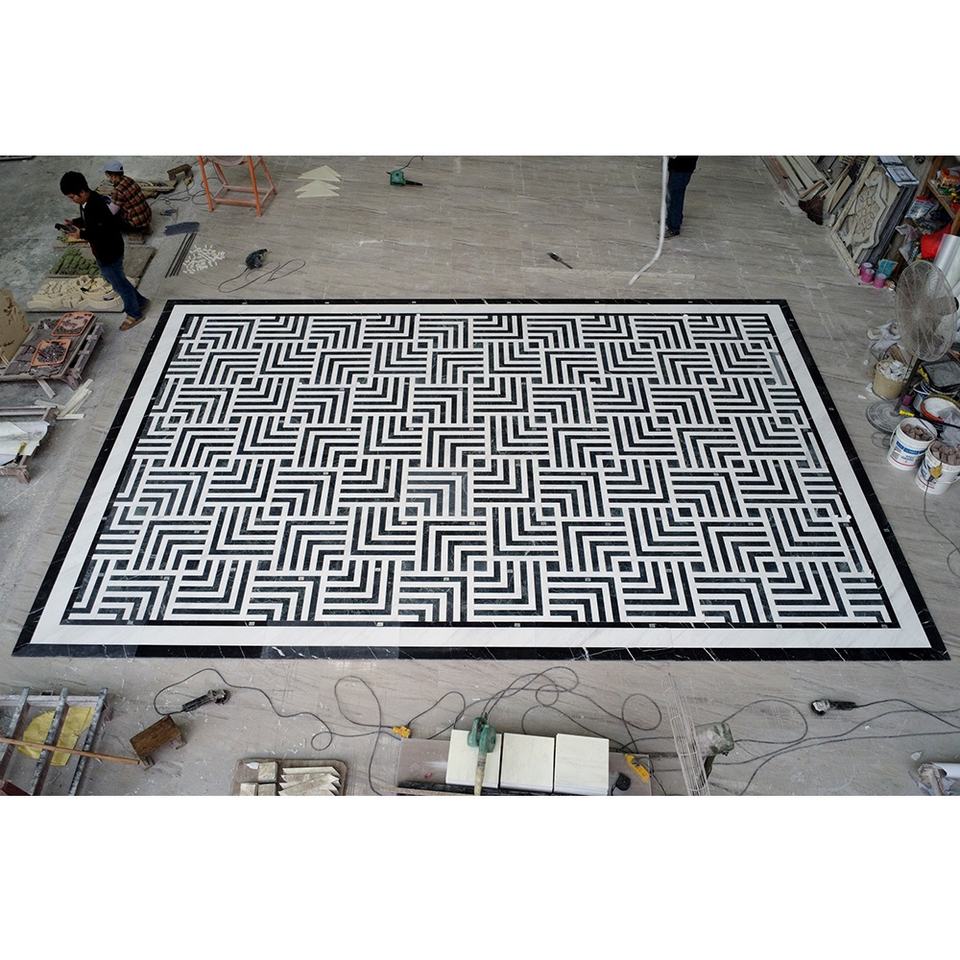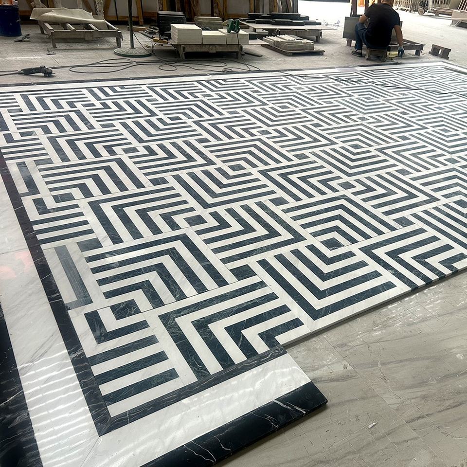 Natural White and Black Waterjet Marble Flooring Tile Waterjet Mosaic Tile for Lobby Corridor Floor Marble Tile Project