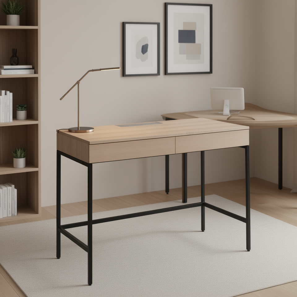 Scrivania in Legno Naturale con 2 Cassetti, Struttura in Metallo Nero, Design Moderno per Casa o Ufficio