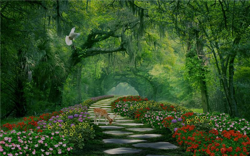 Nature Green Forest Wallpaper Wholesale Canvas Fabric Modern Waterproof Easy Customized Sizes Space Extension Mural Background