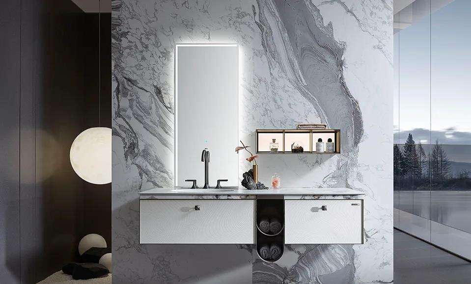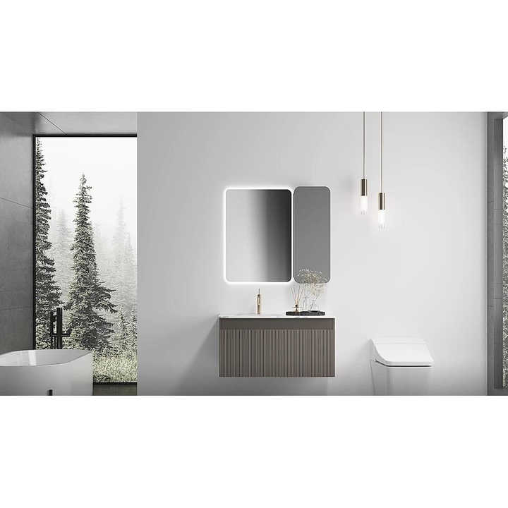 Mobile Bagno Sospeso Neo Luxury Grigio Scanalato con Lavabo, Specchio LED Smart e Mobiletto con Chiusura Ammortizzata