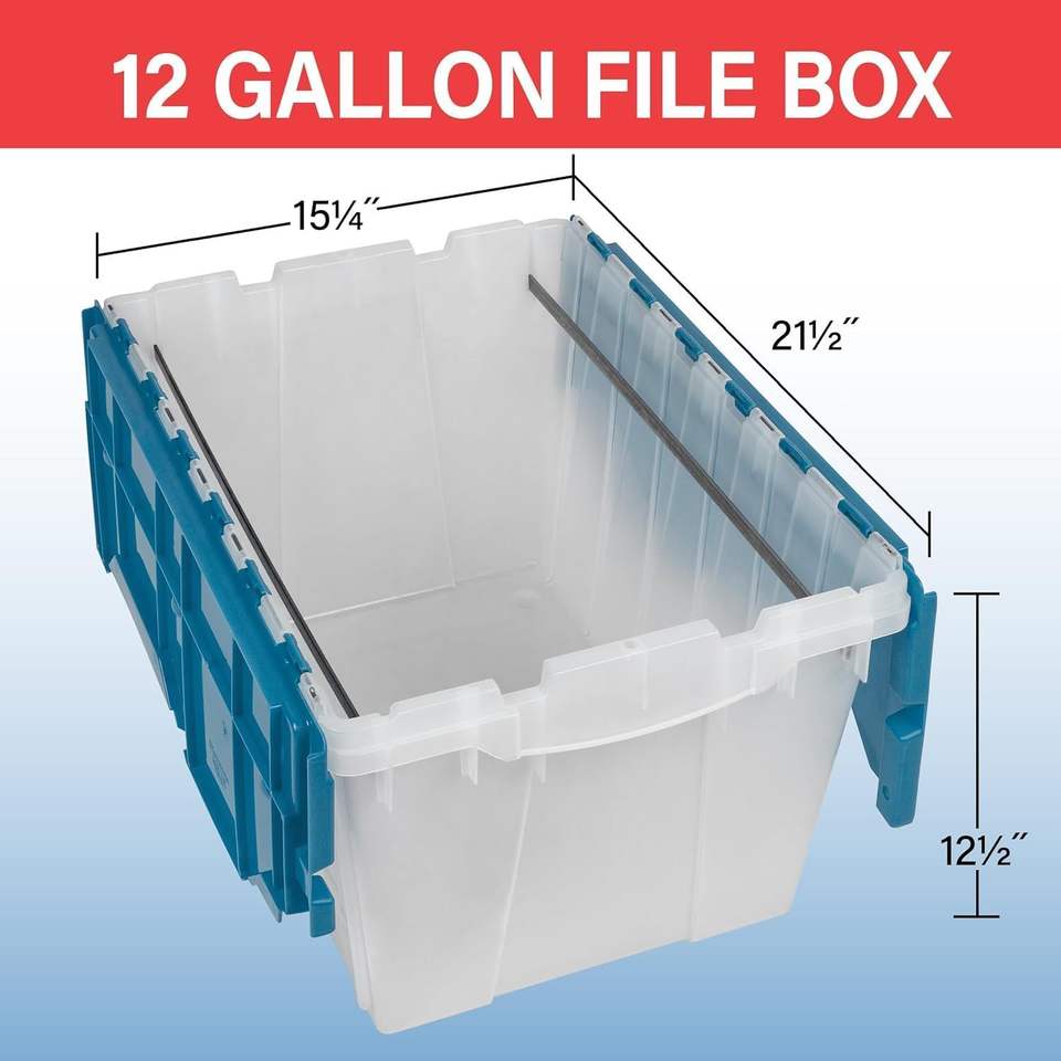 Contenitore di Stoccaggio in Plastica Impilabile da 12 Galloni con Coperchio Integrato e Guide per Archiviazione a Lettera - Armadietto Portadocumenti